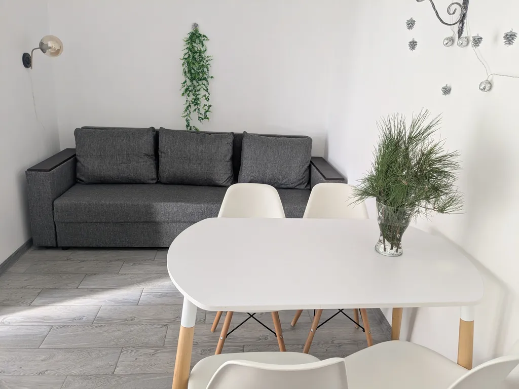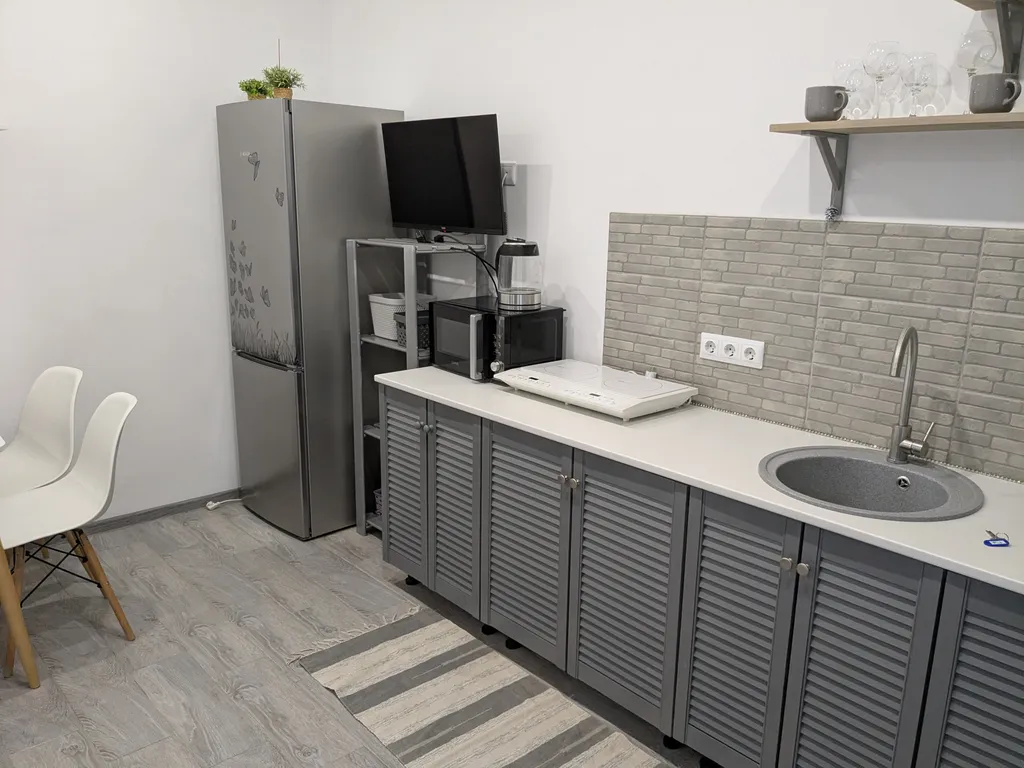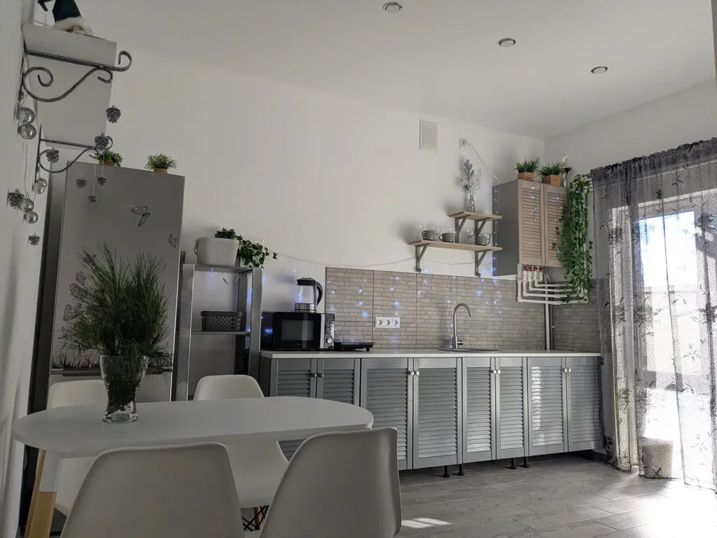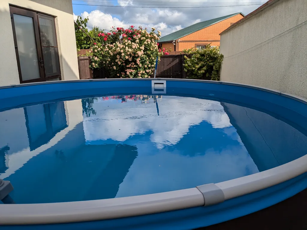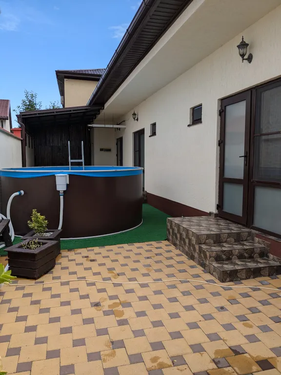 В одной из трёх комнат расположена небольшая кухонная зона со всем необходимым инвентарем. В кухонной зоне есть раскладной диван. Также санузел с душем, кондиционер. В летнее время присутствует на территории каркасный бассейн 300х100 см. Мангал и зона барбекю.