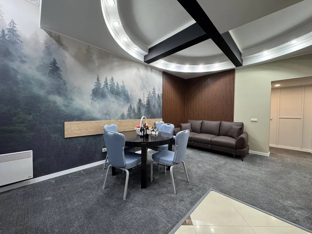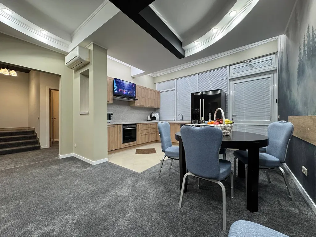 В апартаментах имеется три спальни и 3 туалета с душевыми, кухня- столовая и зона отдыха с бассейном, сауна.