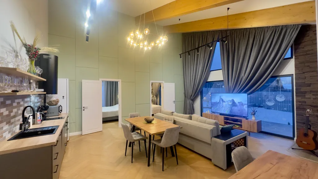 Рядом с кухней расположена просторная гостиная с большими панорамными окнами, на мягком диване вы сможете с комфортом расположиться компанией перед огромным телевизором и отлично разместиться на нем же на ночь.