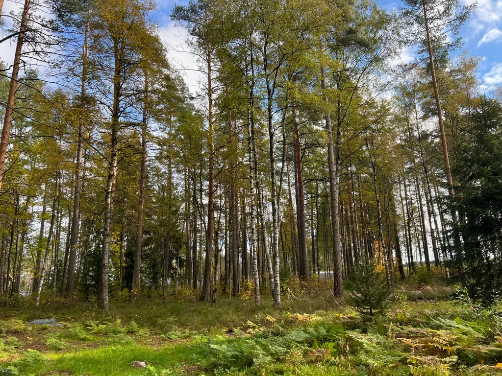 Участок 12 соток ювелирно вписанный в лесной массив с вековыми соснами и взрослыми берёзами. В посёлке достаточно уединенно соседи только с одной стороны.