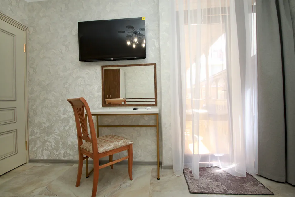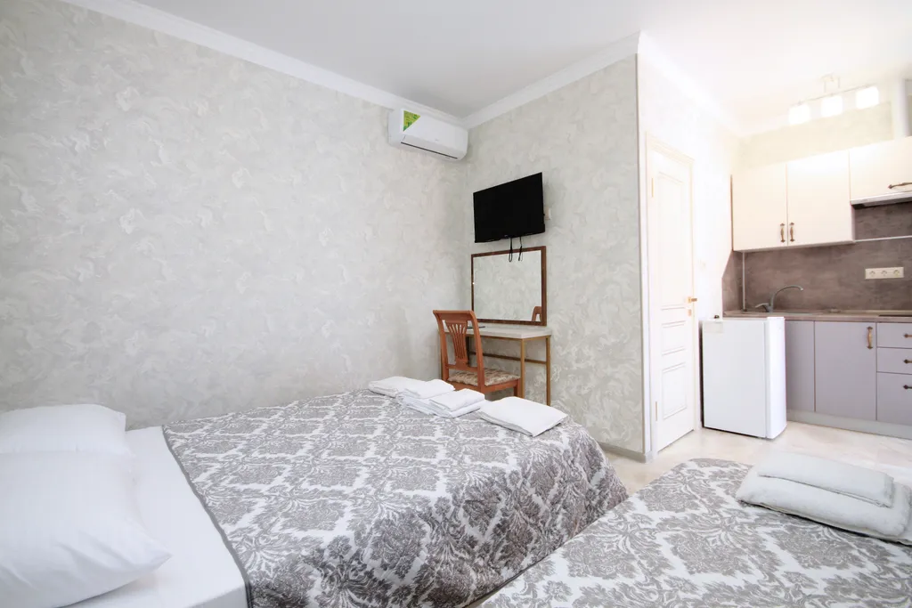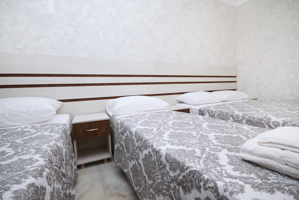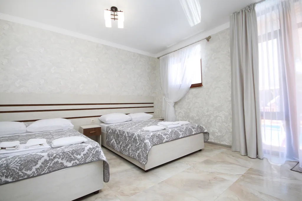 Двуспальная кровать и две односпальные кровати (либо две двуспальные кровати), тумбочки, шкаф, зеркало, телевизор, сейф, сплит-система, санузел (туалет, раковина, ванна, фен).