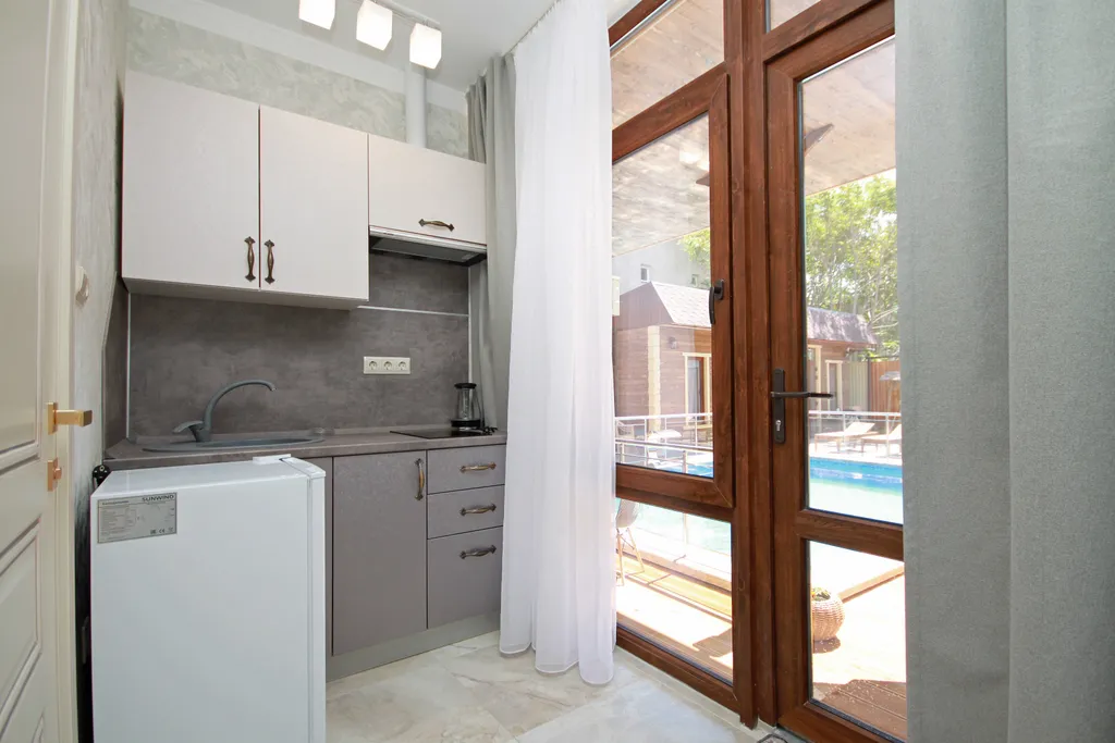 Терраса со столиком для каждого коттеджа (может быть не у двери коттеджа). Не все коттеджи расположены у бассейна.
