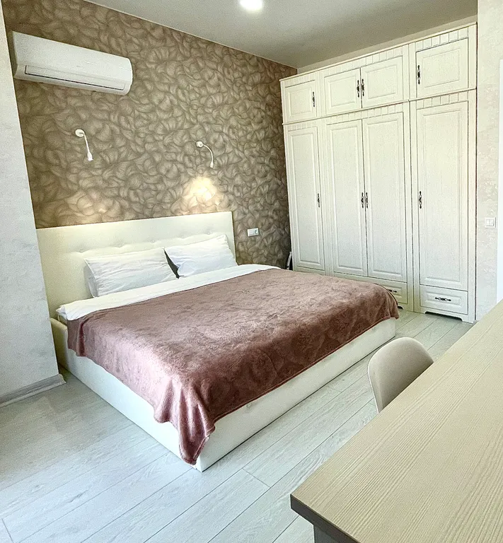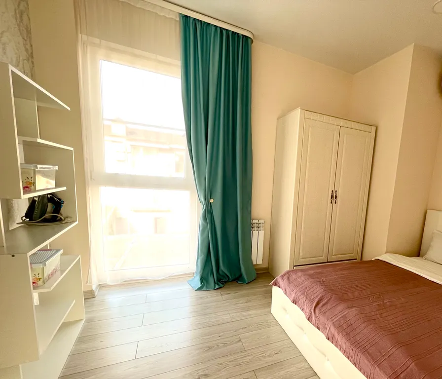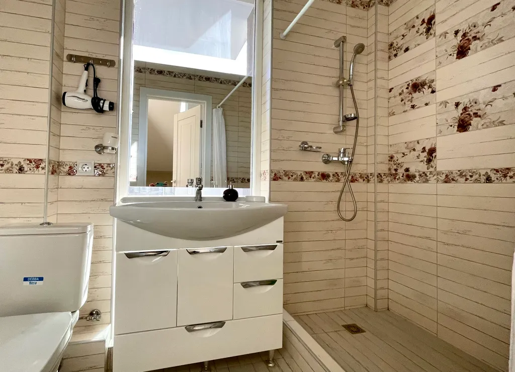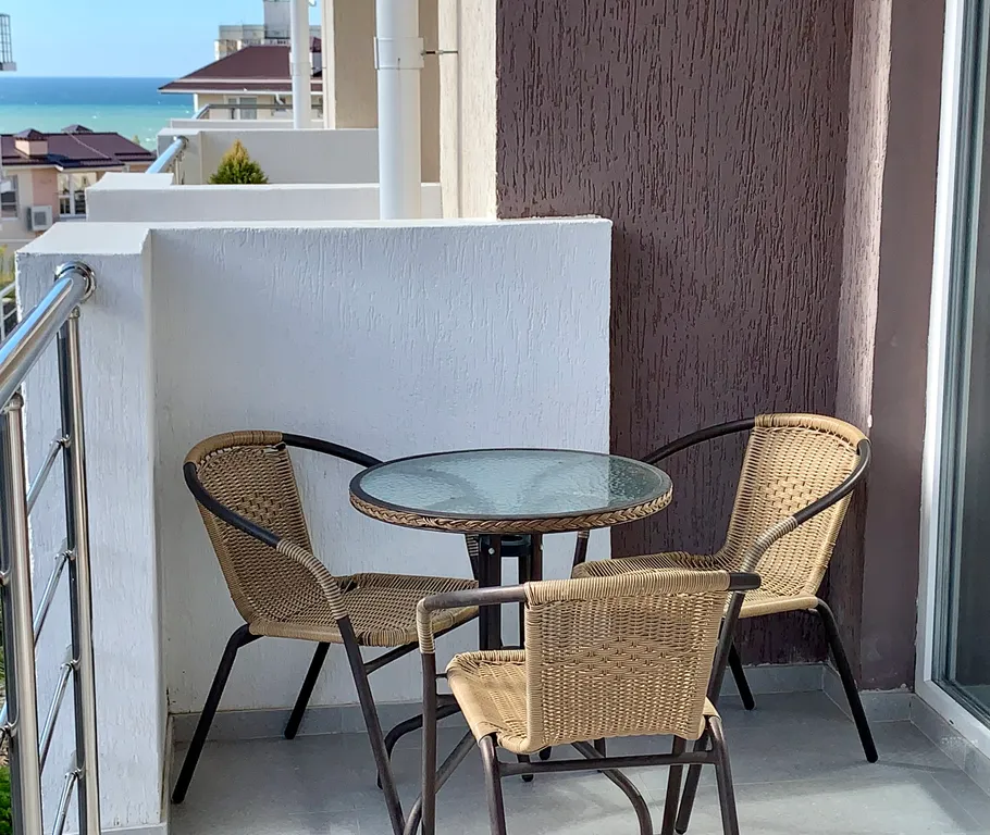 На втором этаже: закрытая спальня с двуспальной кроватью, открытый зал с угловым раскладным диваном, огромный балкон с видом на море, санузел.