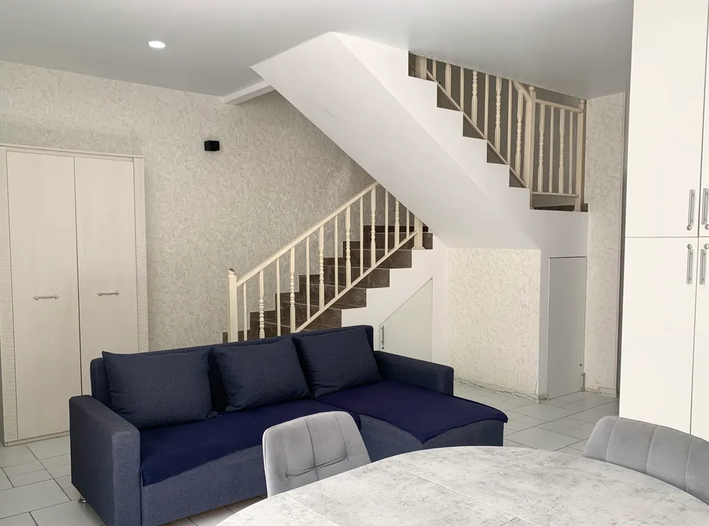 На первом этаже: гостиная с кухней, угловой раскладной двухспальный диван, санузел.