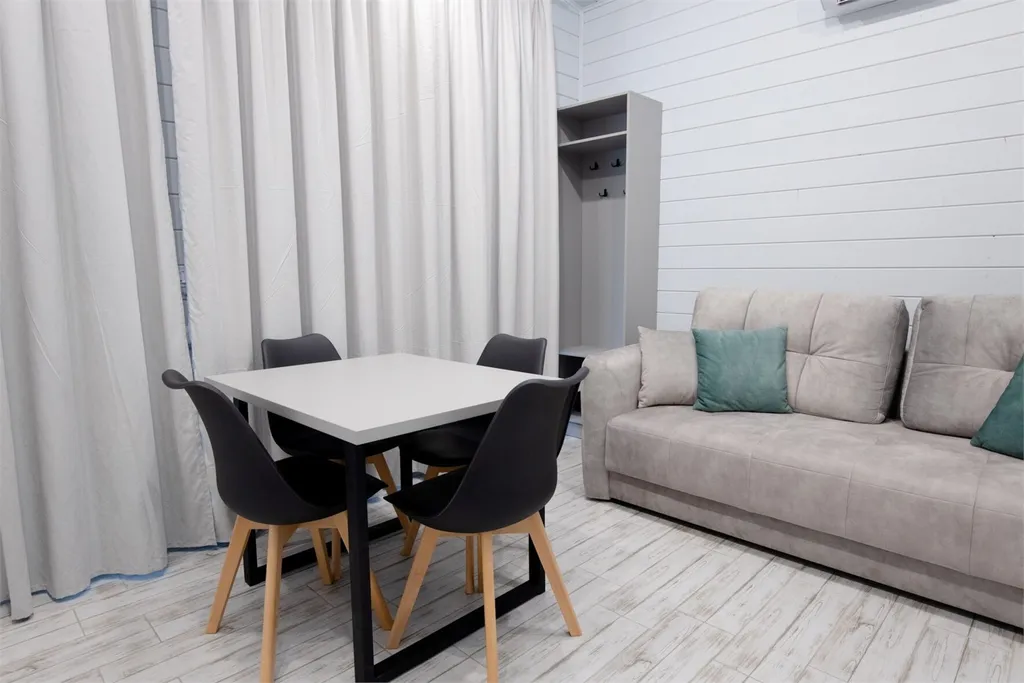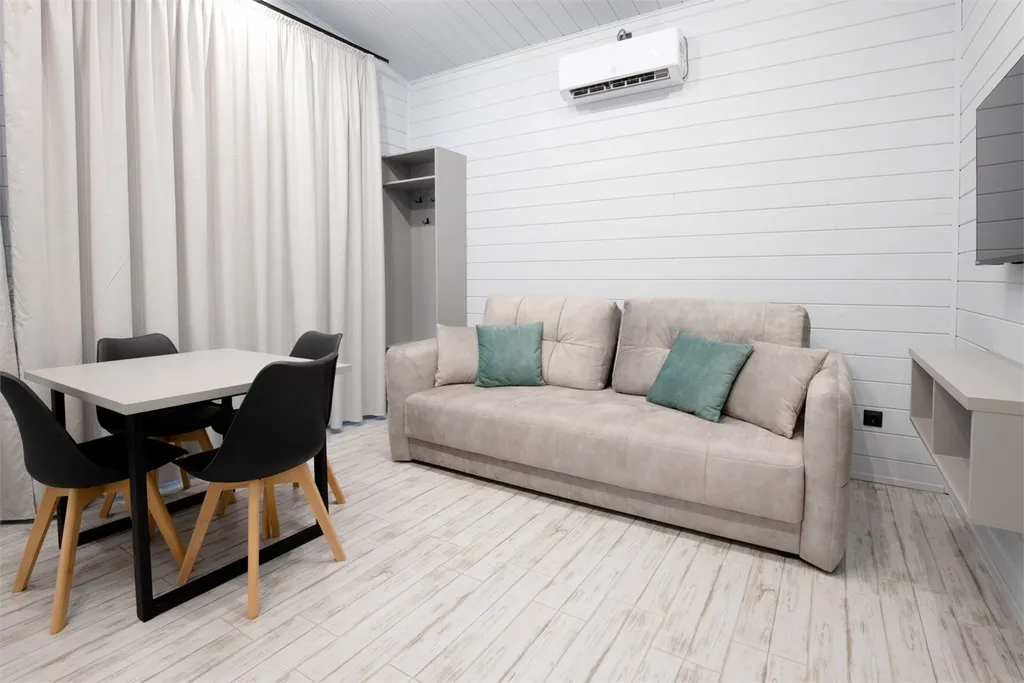 терраса 15 кв.м оснащена мебелью; две спальни оснащены кондиционером, ТВ, 2 кровати (соединяются топпером); гостинная+кухня- оснащены всем необходимым для отдыха, хранения и приготовления пищи.