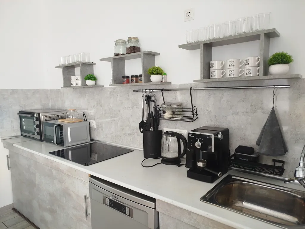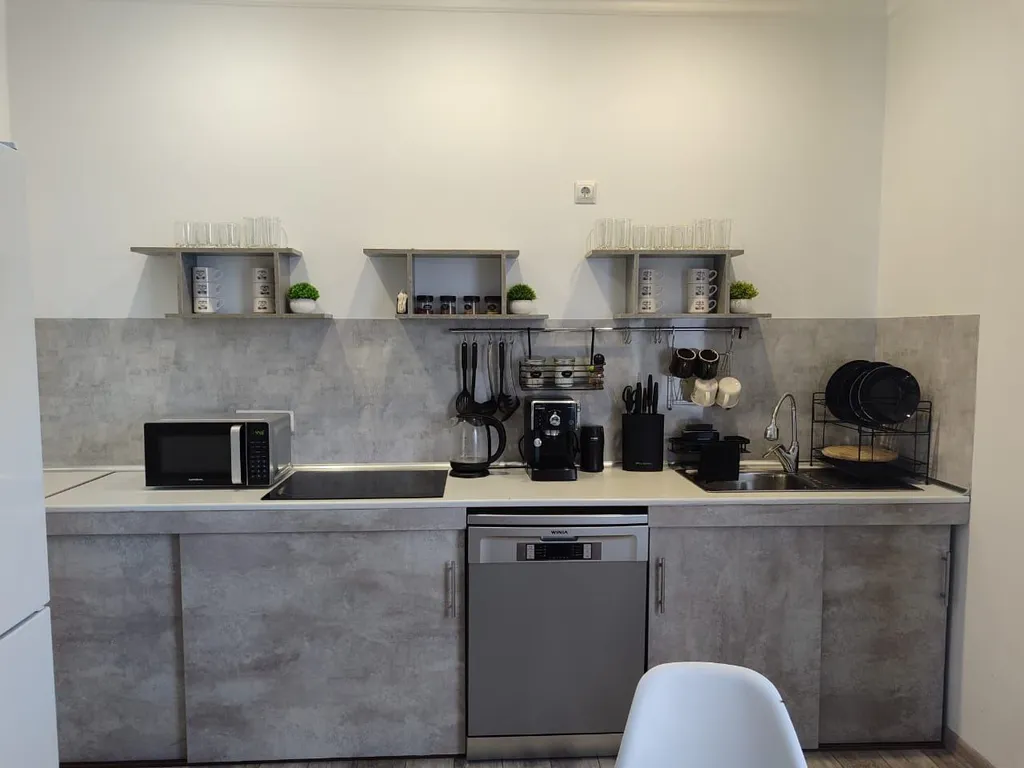 - Полностью оборудованная кухня: холодильник, посудомоечная машина, кофемашина, индукционная плита, соковыжималка, посуда и столовые приборы (на 12 человек), кастрюли, сковороды, казан и др.