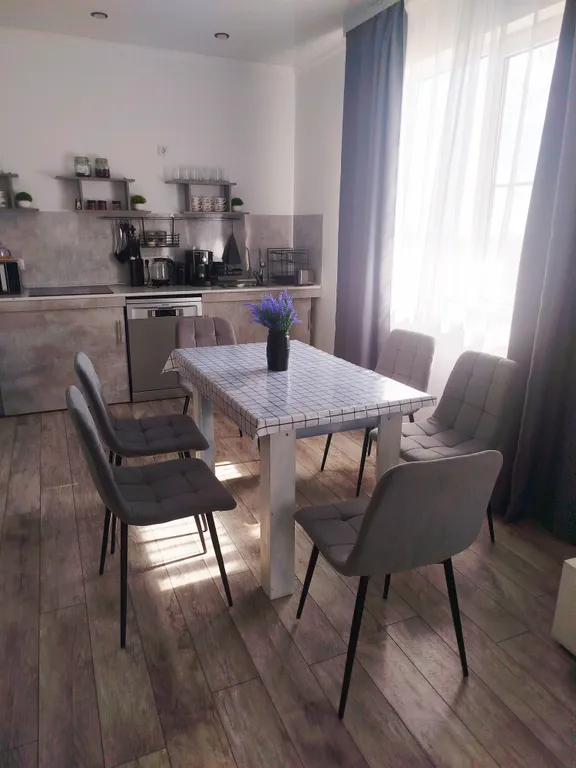 - 4 спальни + просторная кухня-гостиная — размещение до 11 человек (2 двуспальные кровати, 2 дивана, 2 односпальные + детская кроватка).