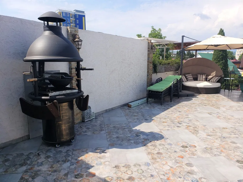Квартира состоит из спальни и кухни-гостиной, душевой кабины с туалетом и быт. техники: кондиционер, стиральная машина, холодильник, телевизор, микроволновая печь, чайник и, конечно, интернет. Район с развитой инфраструктурой в шаговой доступности от моря, рядом набережная, рестораны, кафе, аптеки, поликлиника, банки, почта, рынок, салоны красоты, торговые центры, к/т и т. д. Удобная транспортная развязка, до Сочи и Красной Поляны 30 мин., до Олимпийского парка 10 мин. на общественном транспорте. Имеются в наличии несколько квартир в одном доме. Квартиры сдаются как на длительный, так и на краткосрочный период. Также есть дворик, где приятно можно провести время и поиграть детям. На верхнем этаже расположена терраса с шезлонгами для загара, джакузи и зоной барбекю.