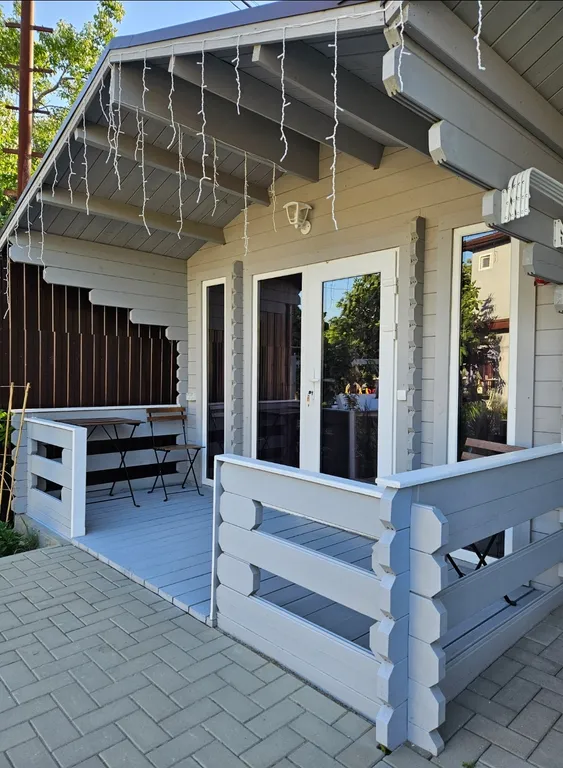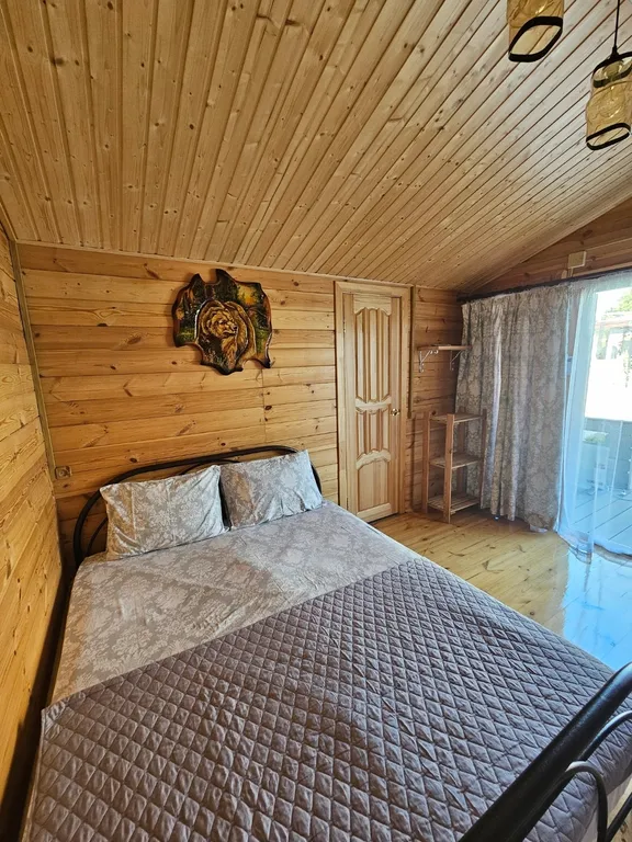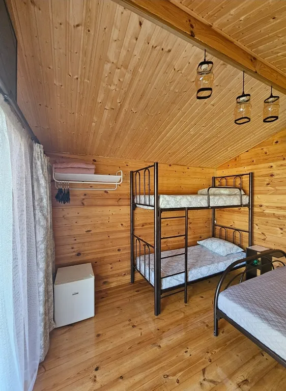 В домике двуспальная кровать, двухъярусная кровать, кондиционер, телевизор, холодильник.