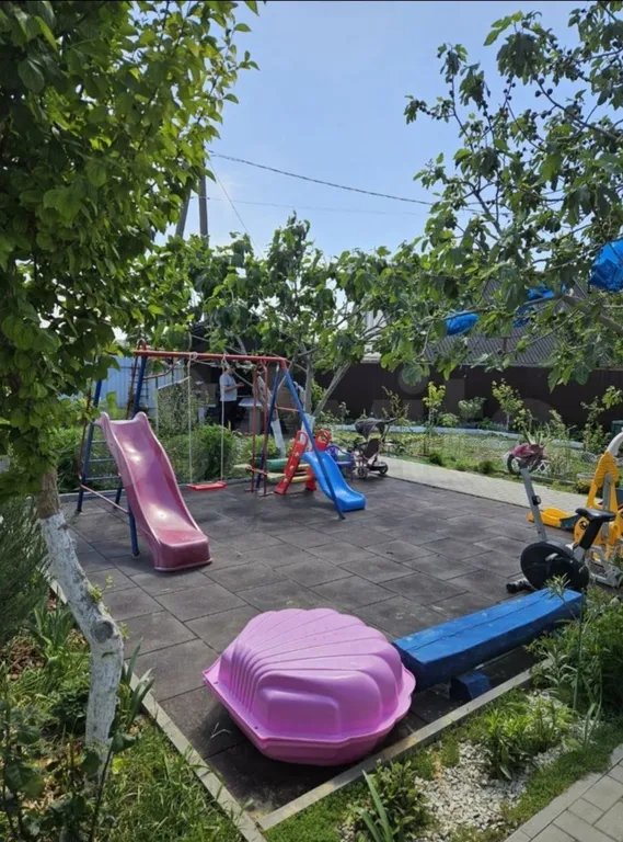 детская площадка в тени деревьев, с качелямии батутом и игрушками.