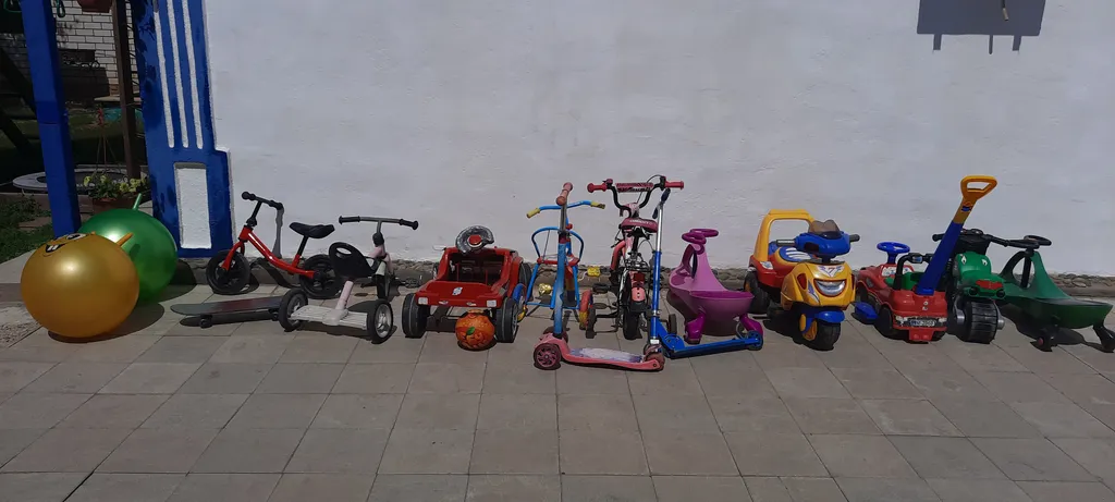 Детский автопарк: велосипеды, электро-машинки, самокат, скейт, толокары, бибикары, мячи- прыгуны, рисовальная доска, тетербол, бадминтон, баскетбольное кольцо.