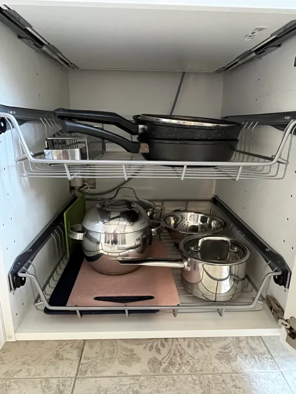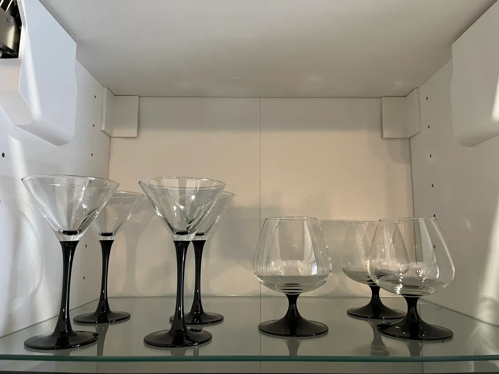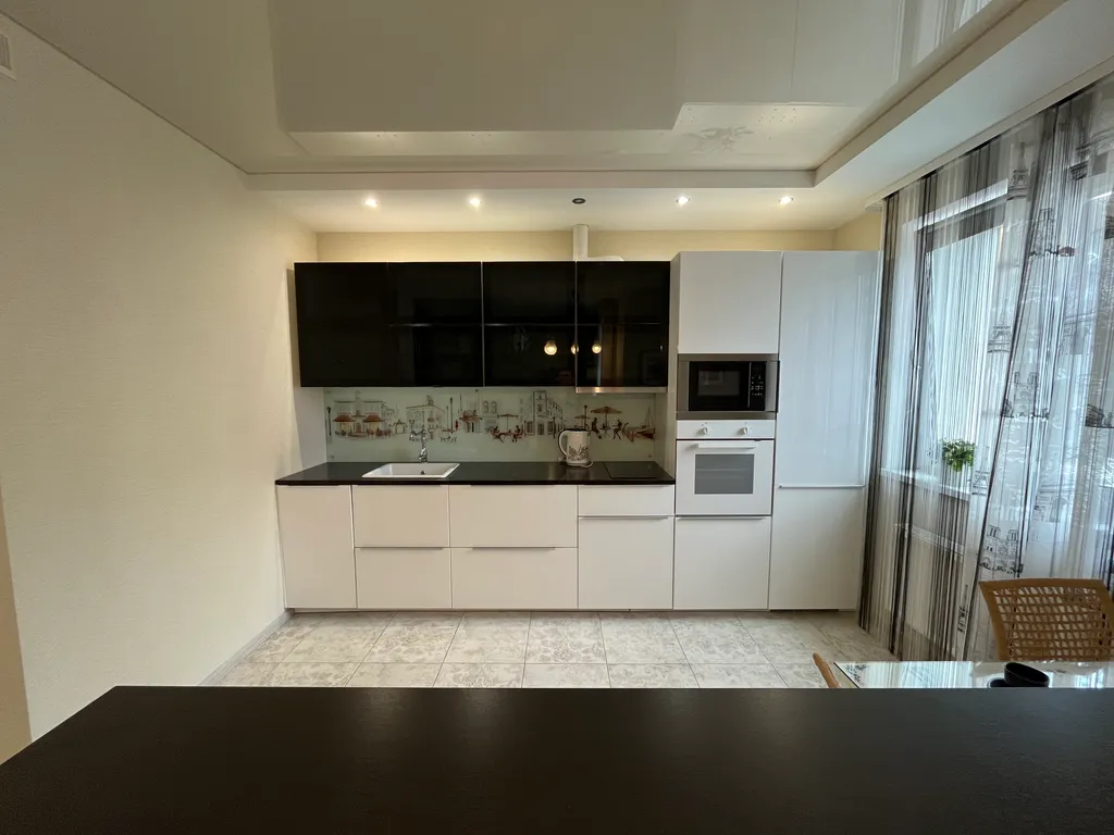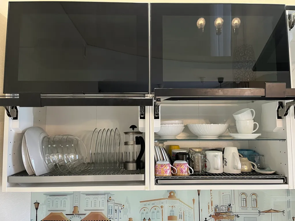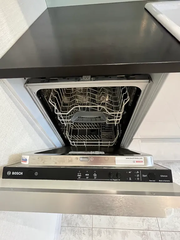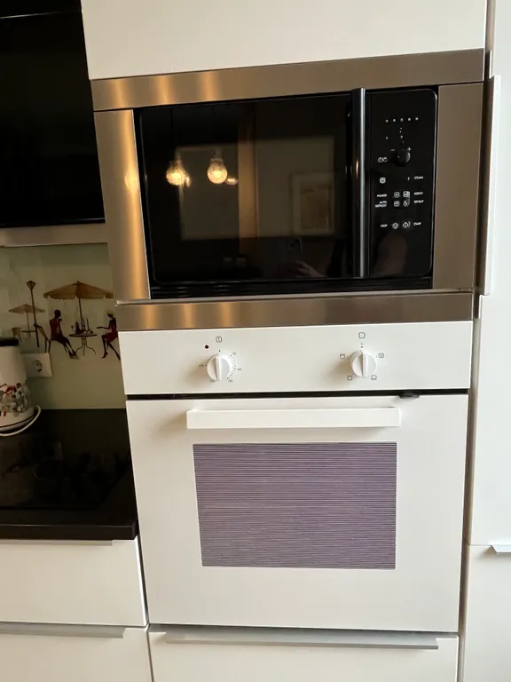 Стиральная машина, встроенный холодильник, микроволновая печь, чайник, стеклокерамическая плита;