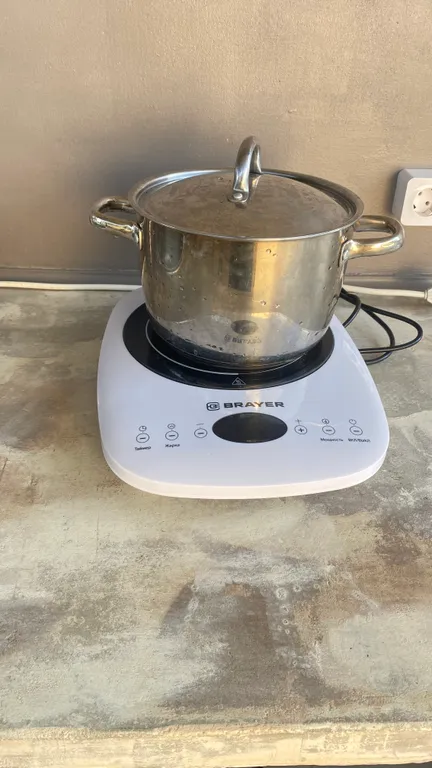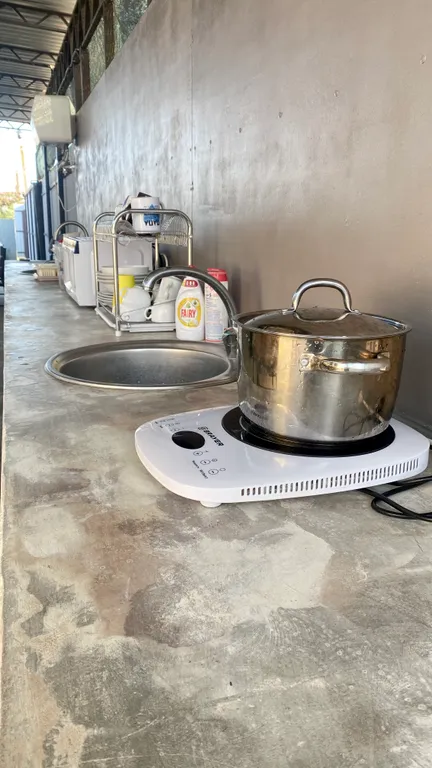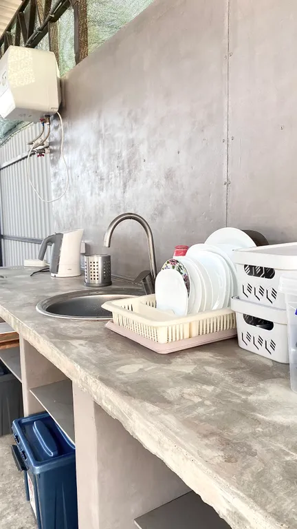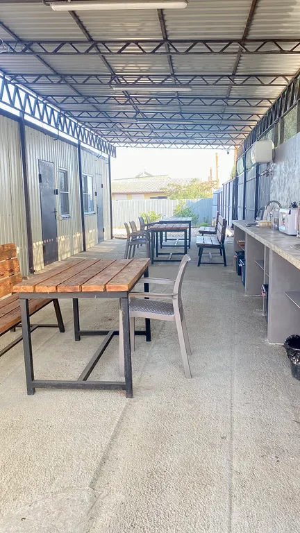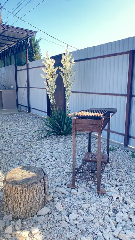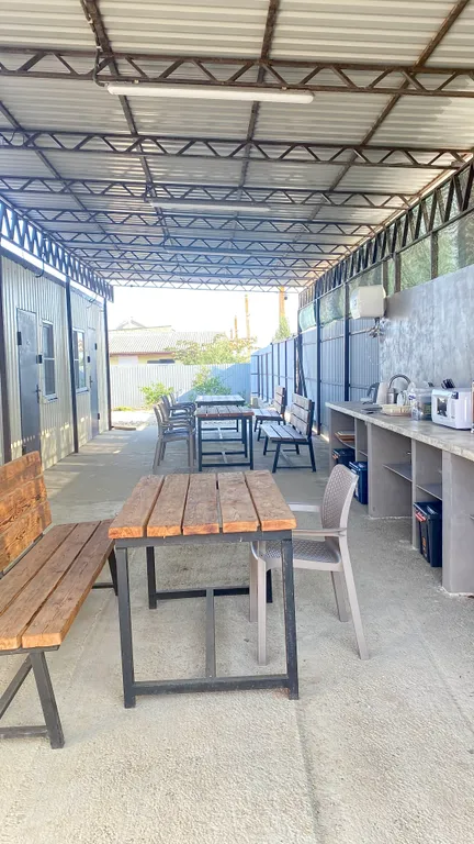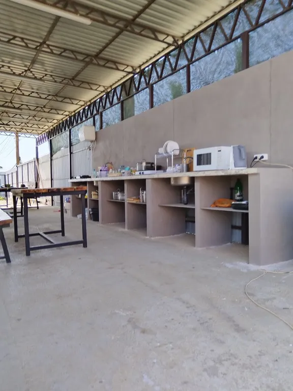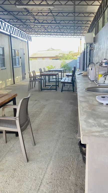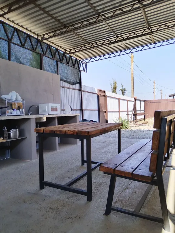 Зона кухни на улице, под навесом, можно комфортно приготовить еду.