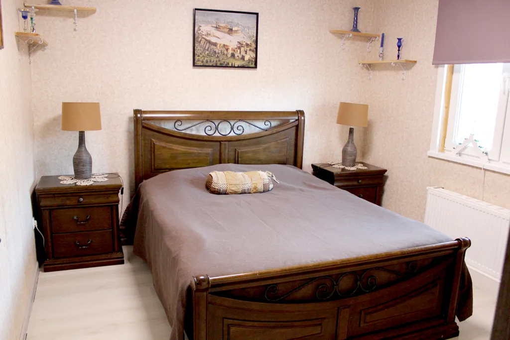 Сдается 2 дома. Этот коттедж (с бассейной и баней). Площадь дублекса + терраса 105 кв. м. Терраса по всему периметру дублекса. Кухня, комната-спальня, комната-спальня, коридор, уборная (душ + туалет), постирочная. Парковка на 2 места. Летом действует бассейн размером 6–8 метров, глубина 60 см. Ёлка украшена до февраля. Баня (сауна) на дровах. Мебель из Малайзии, кухня Икеа. Онлайн-показ с 14:00 до 17:00.