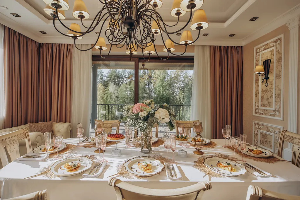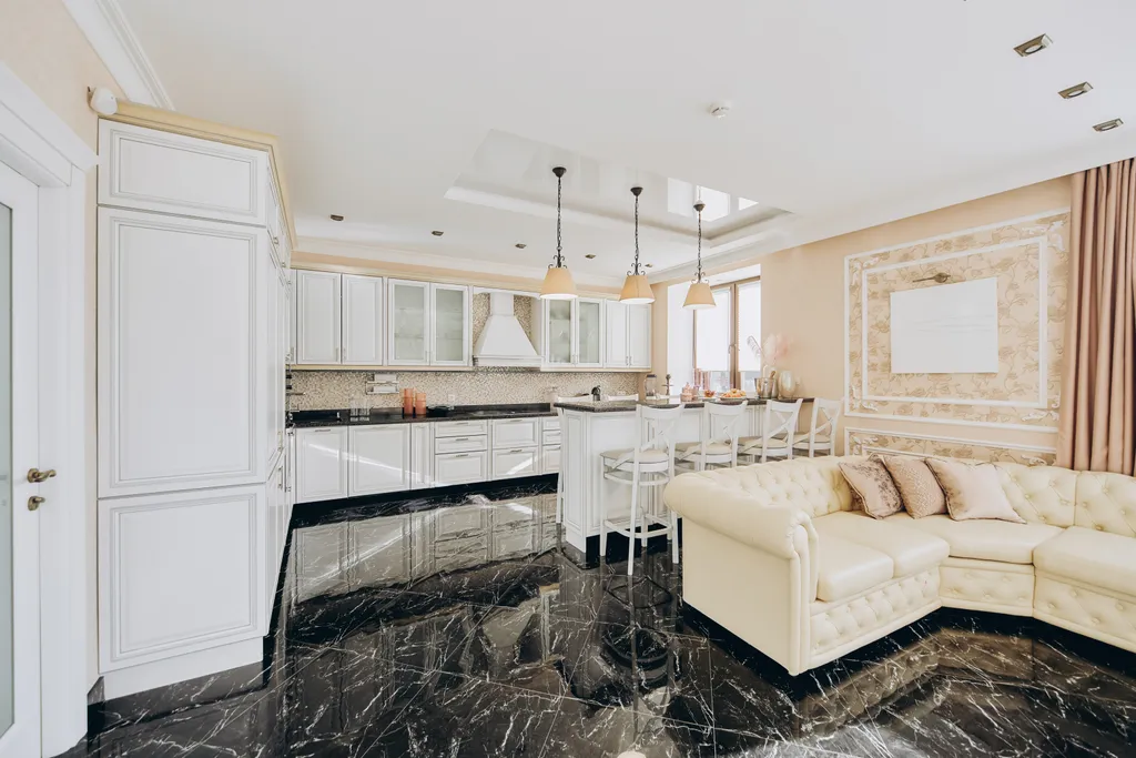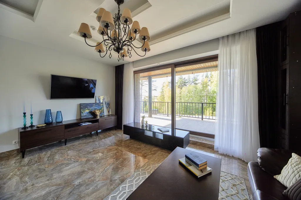 Кухня-гостиная с барной стойкой, комфортной обеденной зоной на 10 человек.