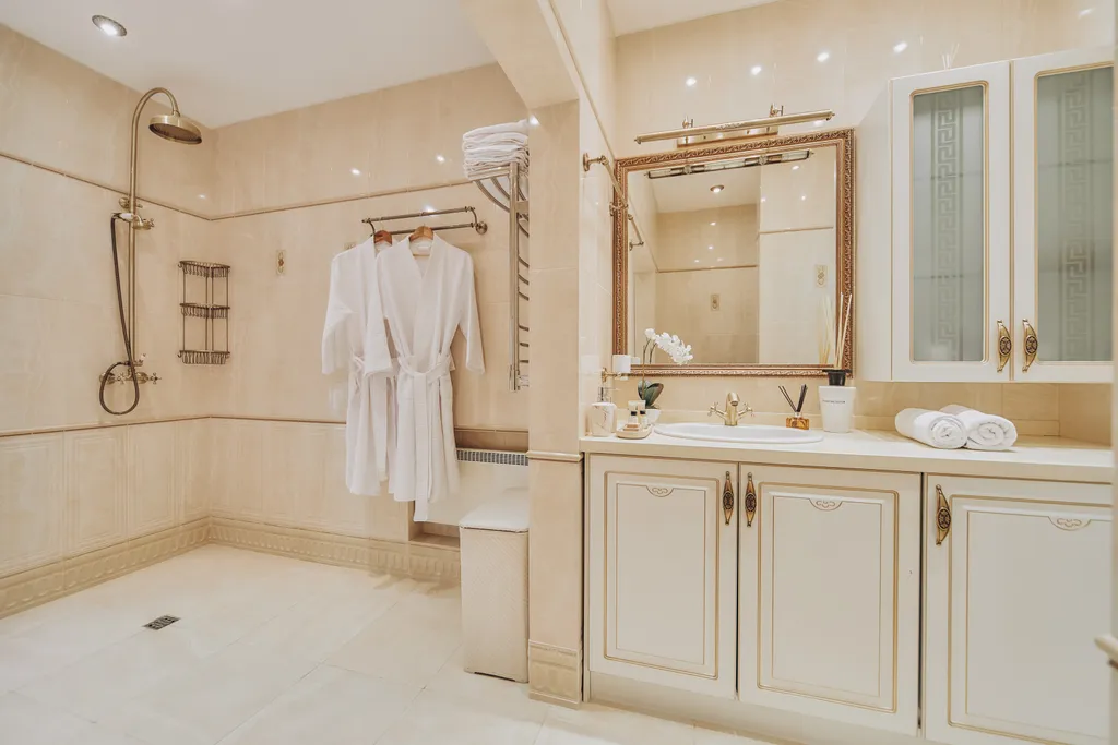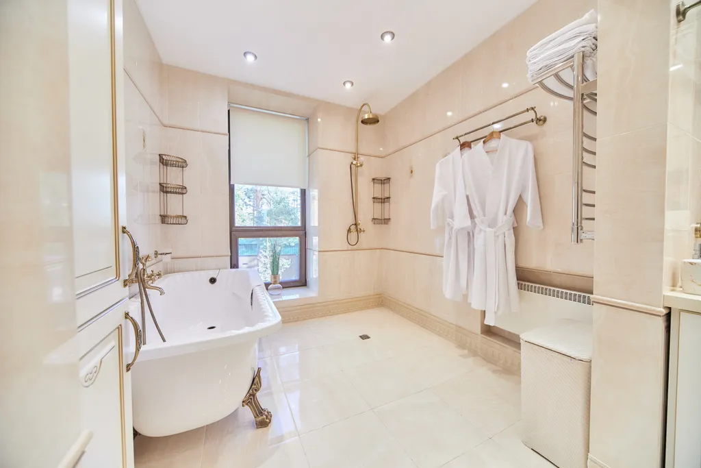 Большая ванная комната с тропическим душем, и ванной-слипер.