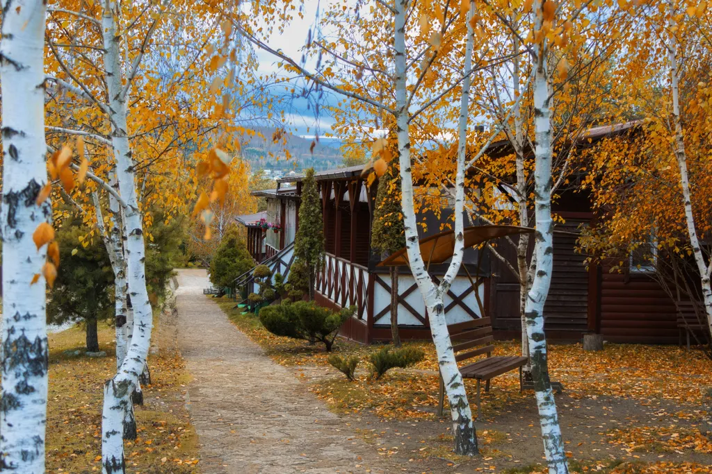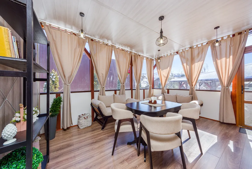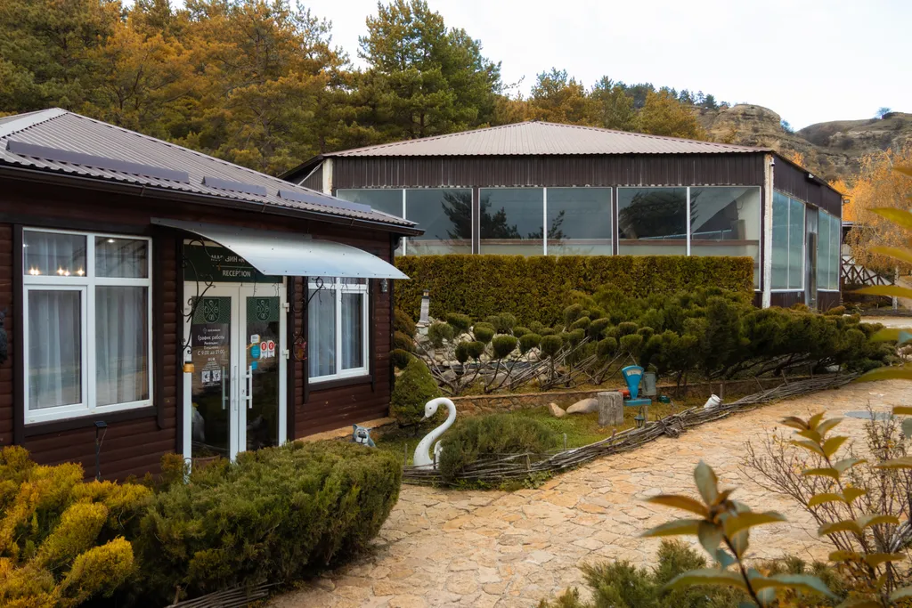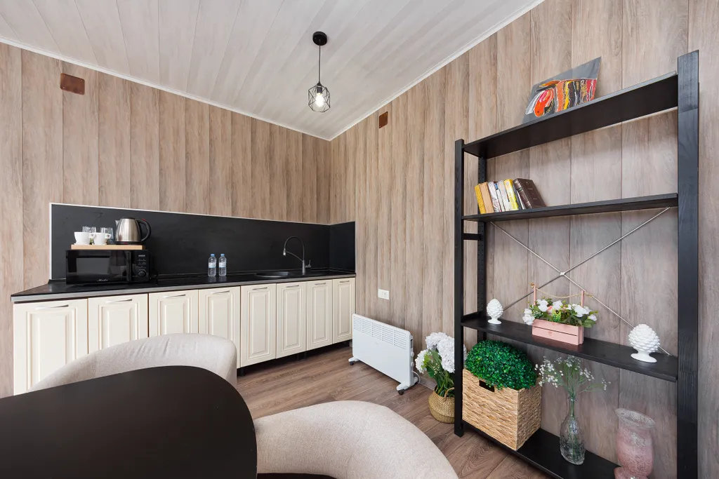 Коттедж представляет собой единое пространство спальни и террасы с кухней и столовой, принимает гостей по системе 2+1.