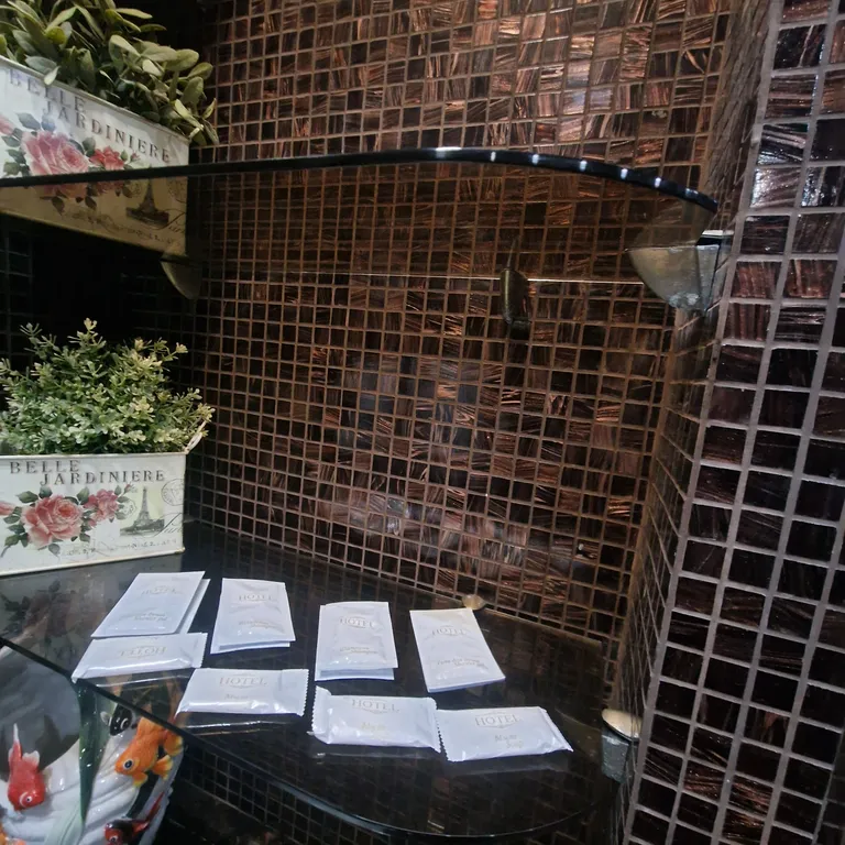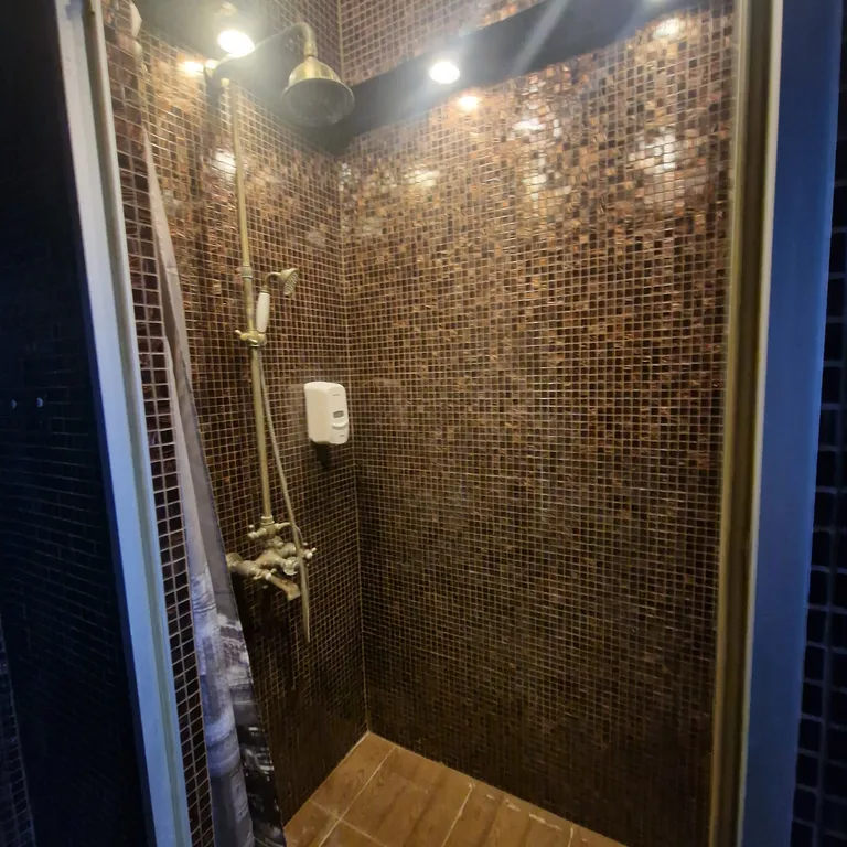 Ванная комната: Современная ванная комната с душевой и туалетными принадлежностями. Для вашего удобства предусмотрены полотенца и тапочки.