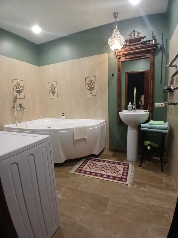 -Большая ванная на двоих с джакузи, водонагреватель, стиральная машинка, средства гигиены