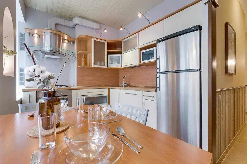 - кухня со всей нужной бытовой техникой и посудой для приготовления еды