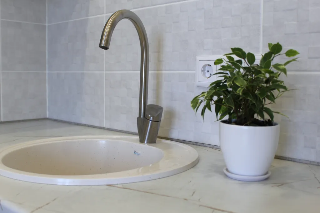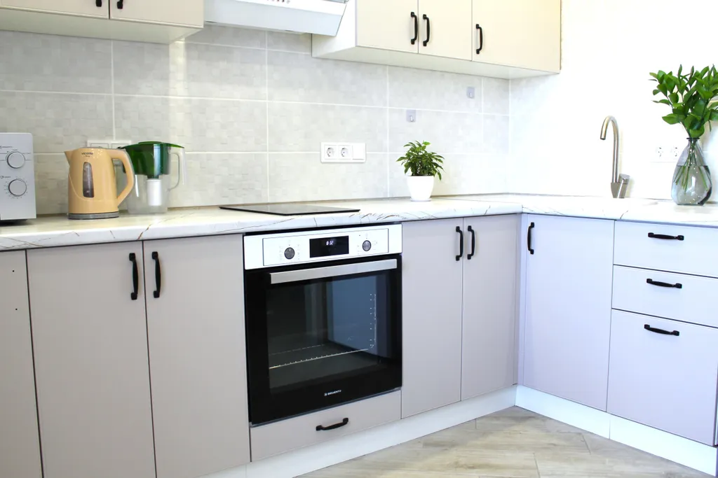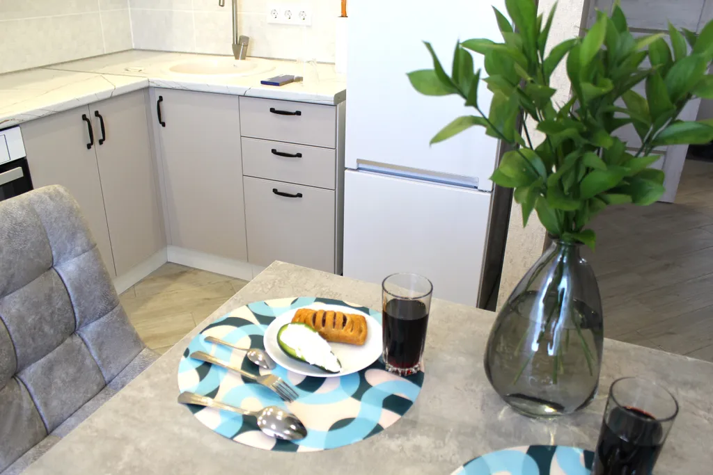 полностью оснащённая кухня: холодильник, варочная панель, микроволновка, чайник, посуда, приборы, фильтр для питьевой воды