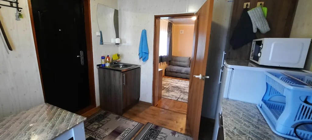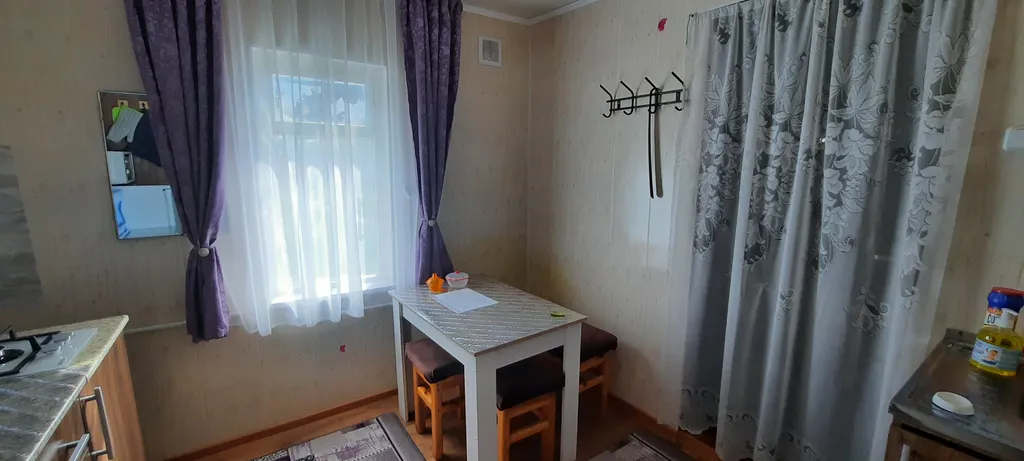 В кухне газ плита, микроволновка, холодильник, эл. Чайник, посуда.