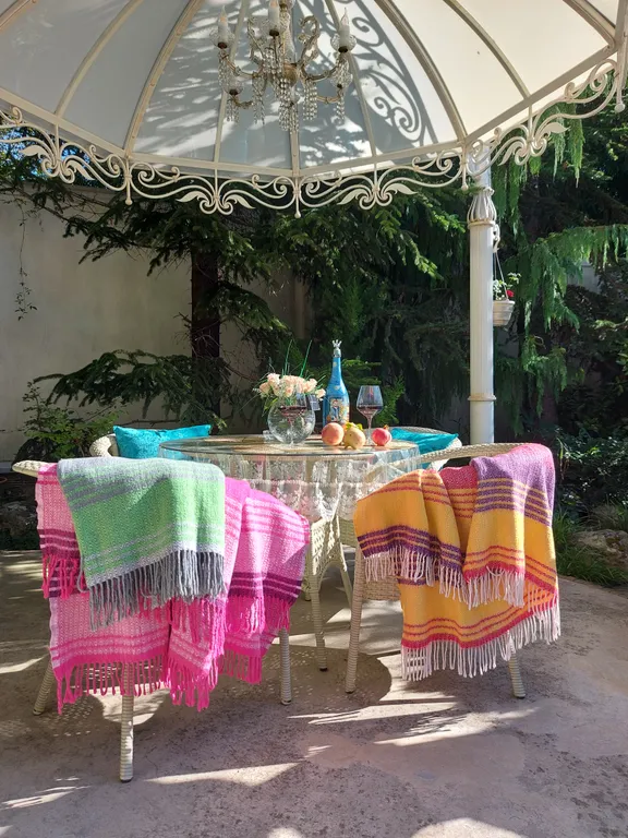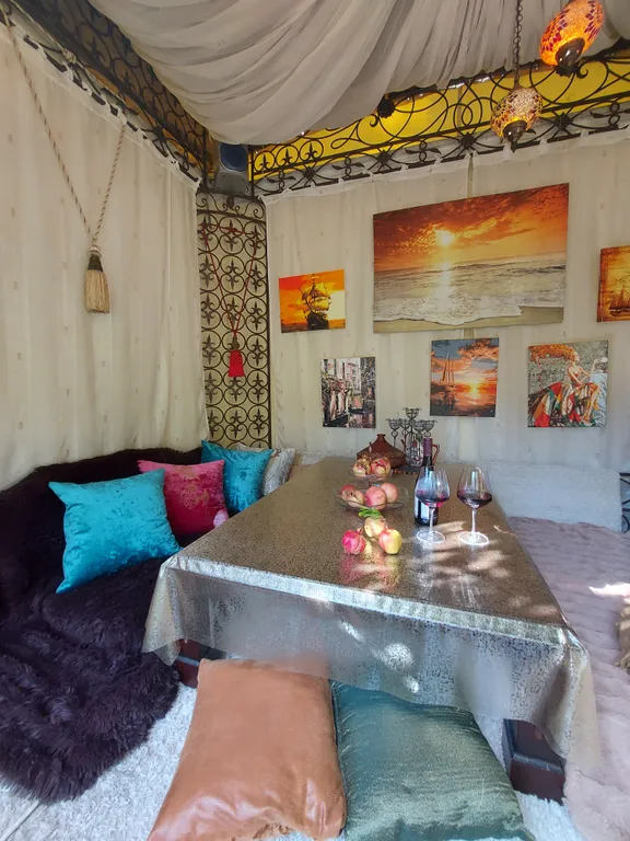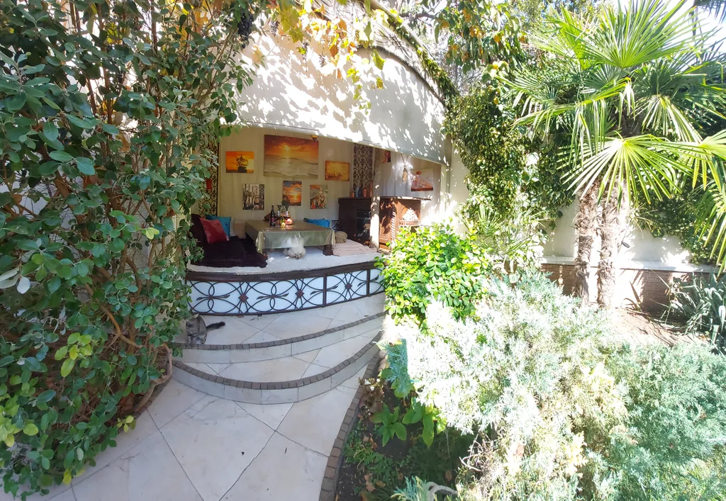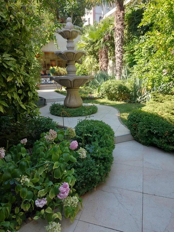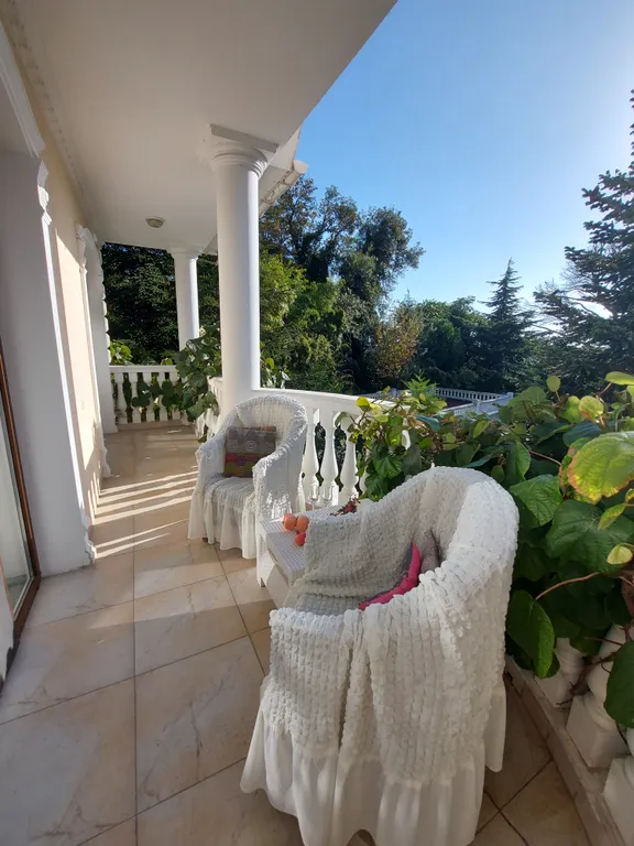 Также на территории есть каменный мангал, беседка, крытая беседка-чайхана, шезлонги. Автостоянка во дворе бесплатная. Территория закрытая и абсолютно безопасная. Дом окружен большим количеством цветов, хвойных деревьев и пальм.