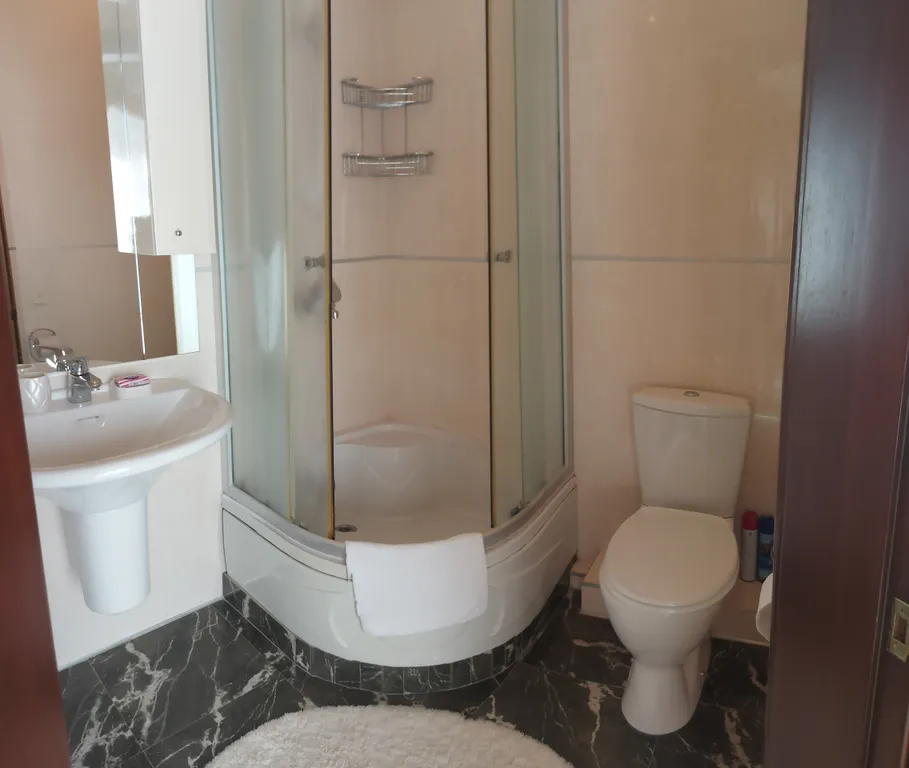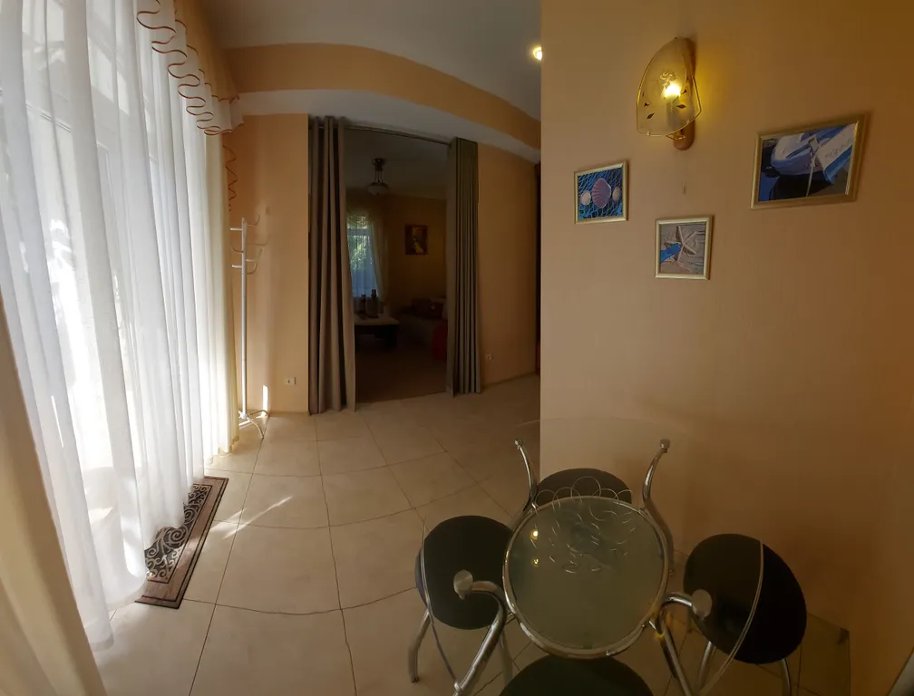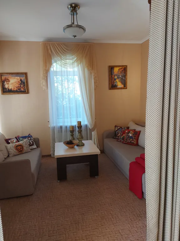 Дом имеет два этажа с отдельным входом на каждый этаж. На первом этаже прихожая, спальня-гостиная с двумя удобными раскладывающимися двуспальными диванами. В кухне есть газовая плита, вытяжка, духовка, микроволновка, холодильник и вся необходимая посуда. Санузел с ванной с гидромассажем. Есть гладильная доска, утюг, фен.