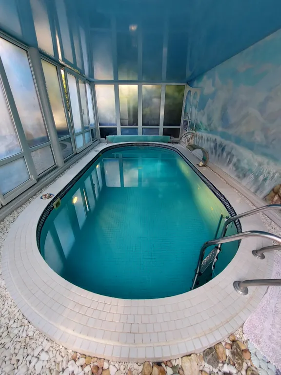 На территории есть крытый бассейн с температурой воды +28С. Бассейн работает круглый год. Время работы бассейна до 23 ч вечера.