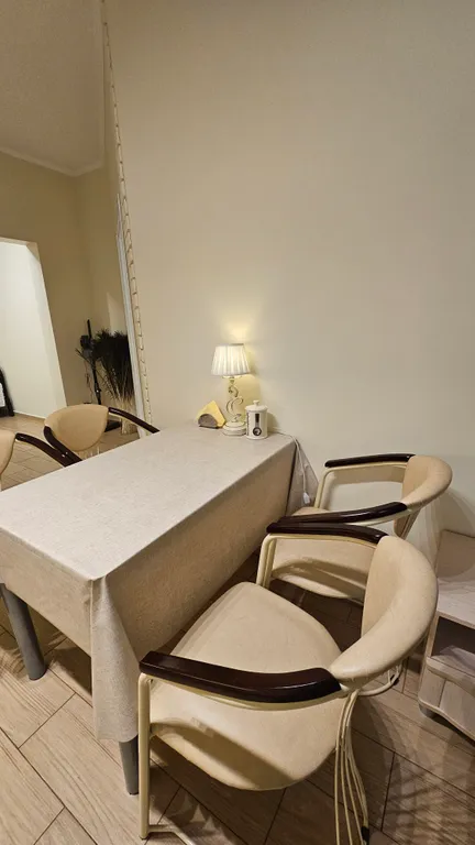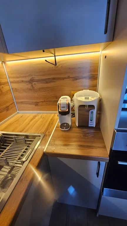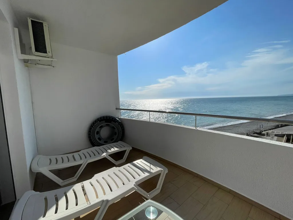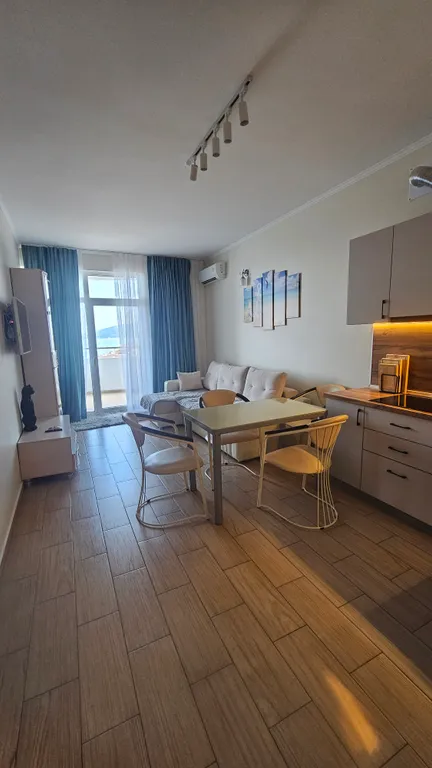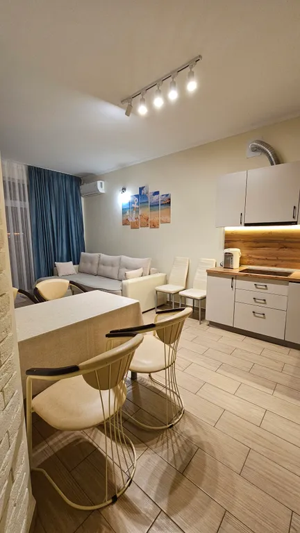 В большой комнате-студии расположена обеденная зона с видом на море, выходом на балкон, раскладной диван и телевизор. Приветственный набор: кофе, чай и прочие приятные мелочи.