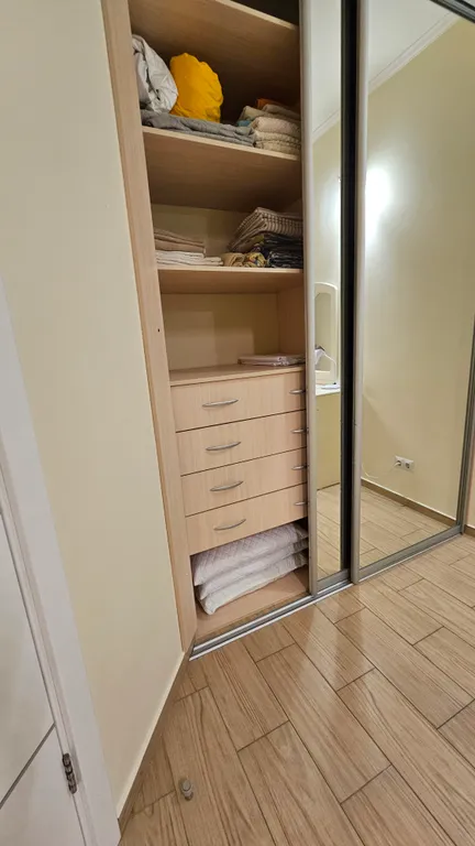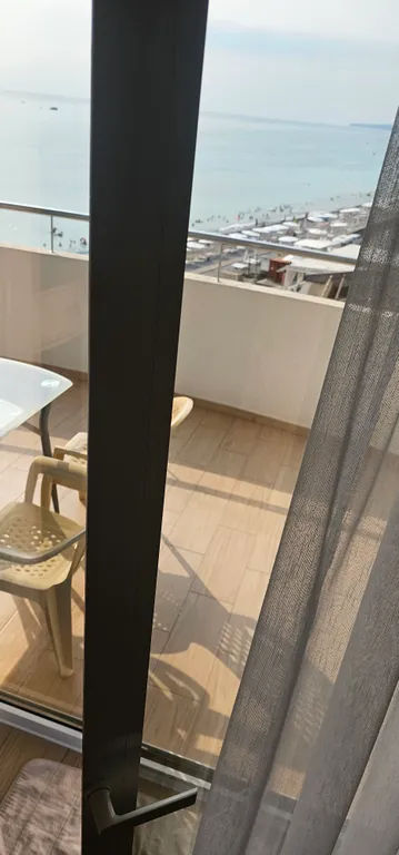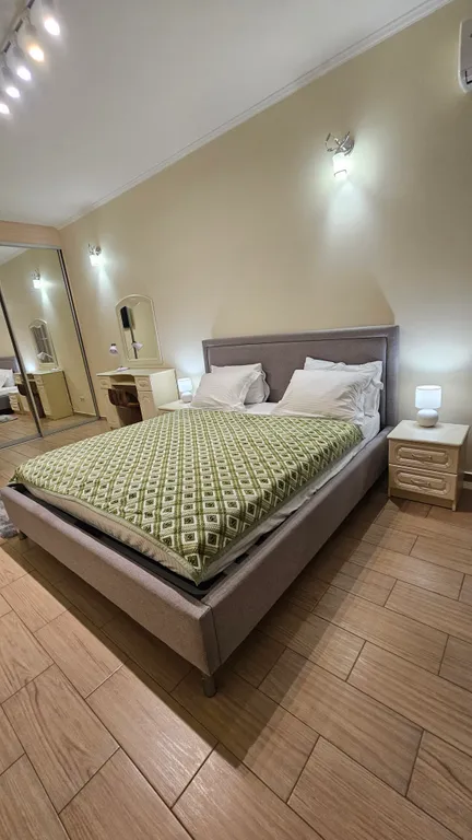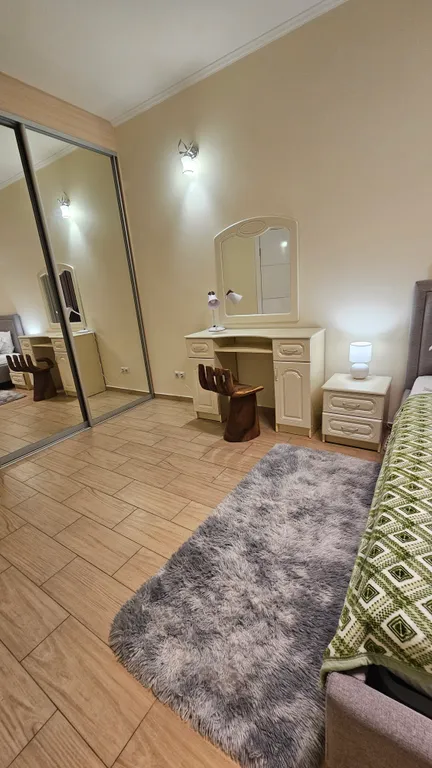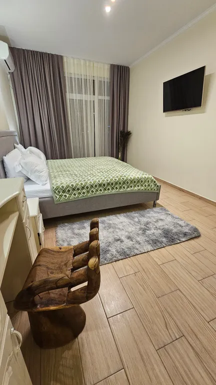 В спальне потрясающий вид на море, панорамное окно с выходом на балкон, большая двуспальная евро кровать, плоский смарт телевизор, шкаф-купе, трюмо с хранением косметики и парфюмерии.