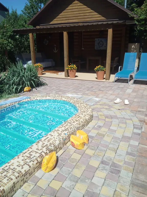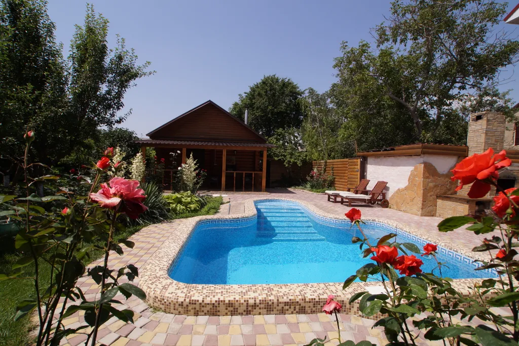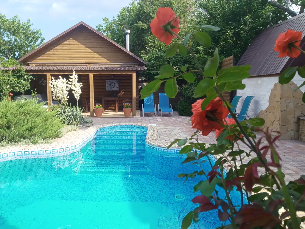 На территории для вас бассейн с подогревом, рядом качель и шезлонги.