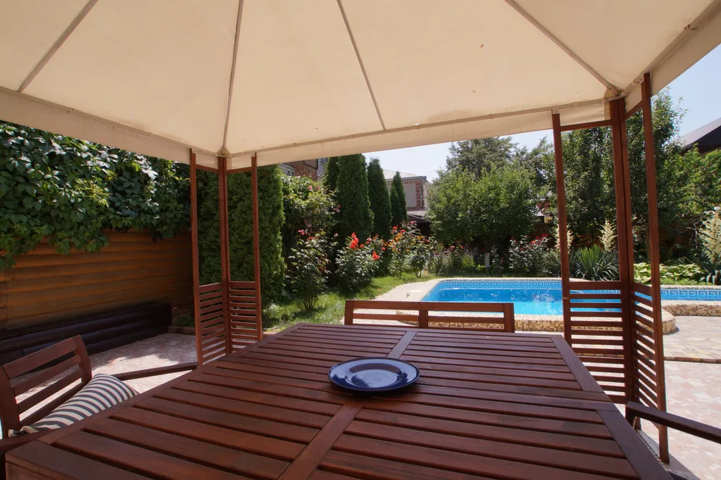Барбекю в зоне отдыха с шатром и большим столом с креслами и диванами. Чайхана в беседке, окружённая розами и высокими туями.