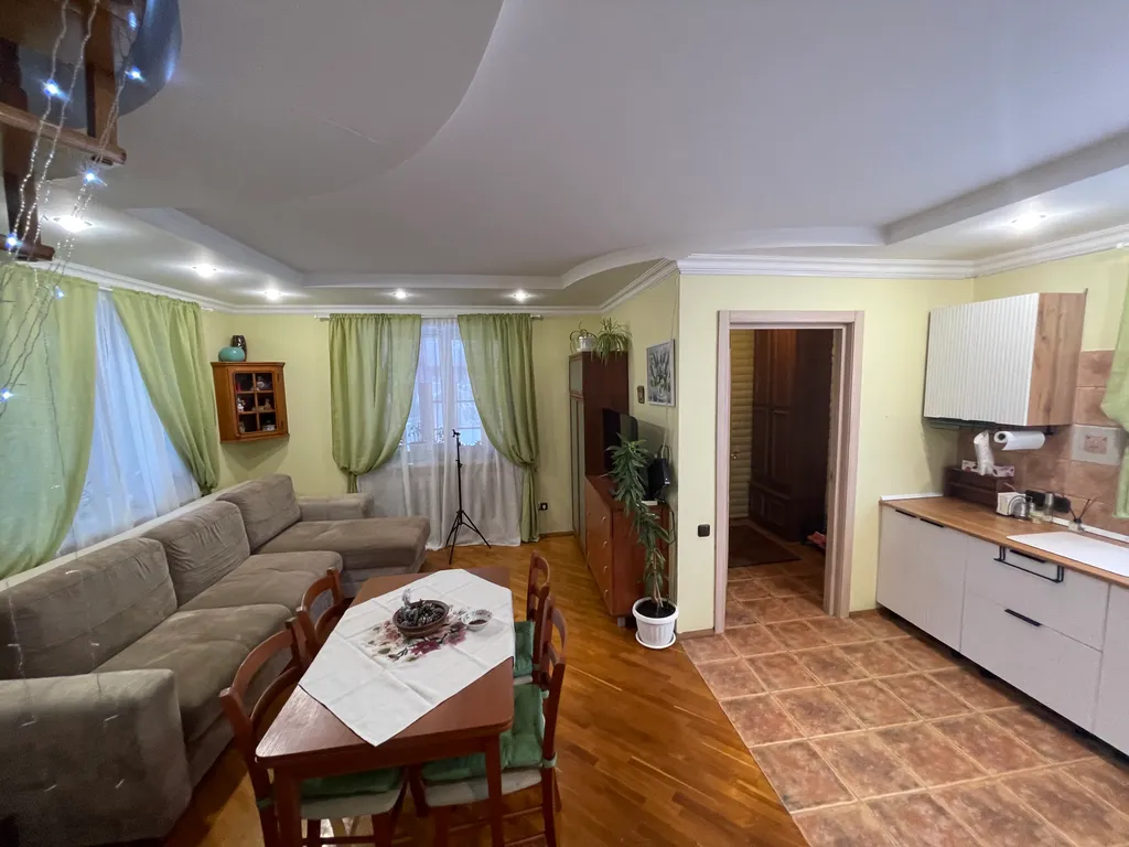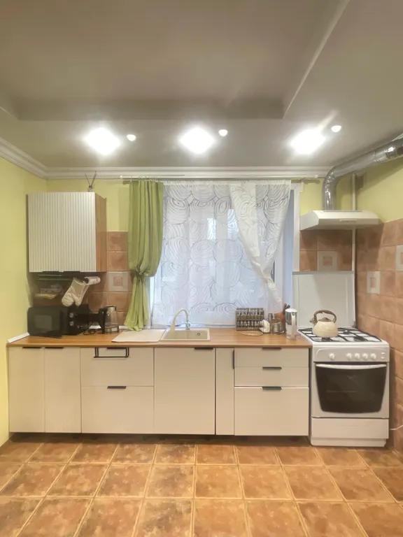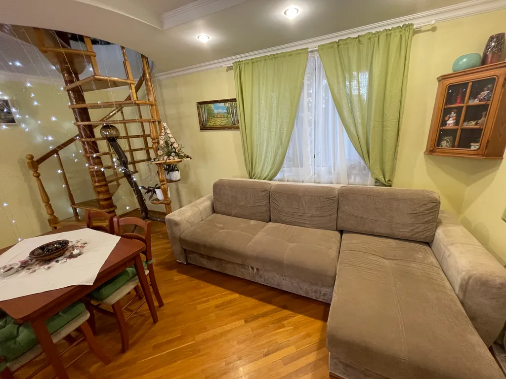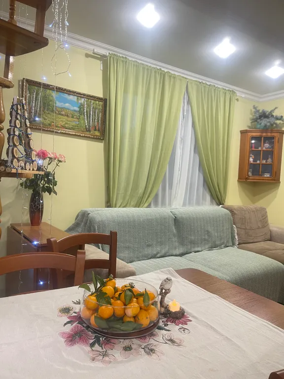 Уютная гостиная, в которой есть обеденный раскладной стол, стулья, большой раскладной диван с атаманкой на 2 спальных места. Телевизор, спутниковое TV, комод, шкаф-сервант.