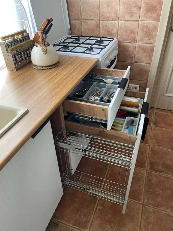 Новая кухня: газовая плита с духовкой, кухонный инвентарь, полотенца, посуда для приготовления и сервировки на 8 человек, большой холодильник с морозилкой, микроволновка, электрический чайник.