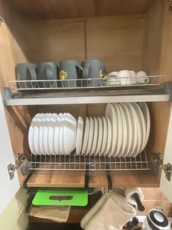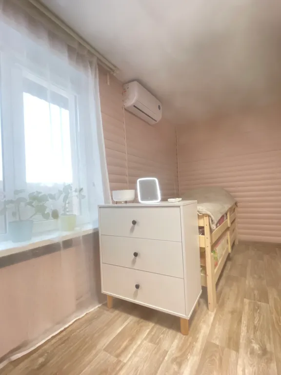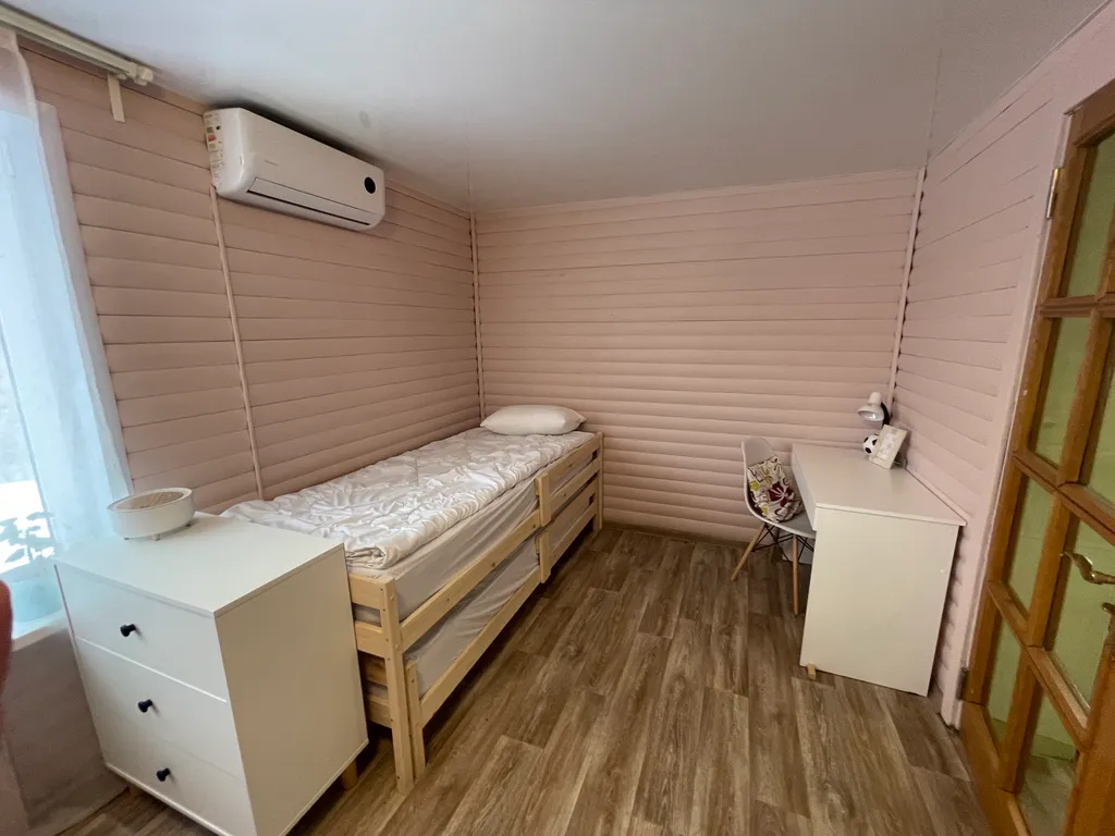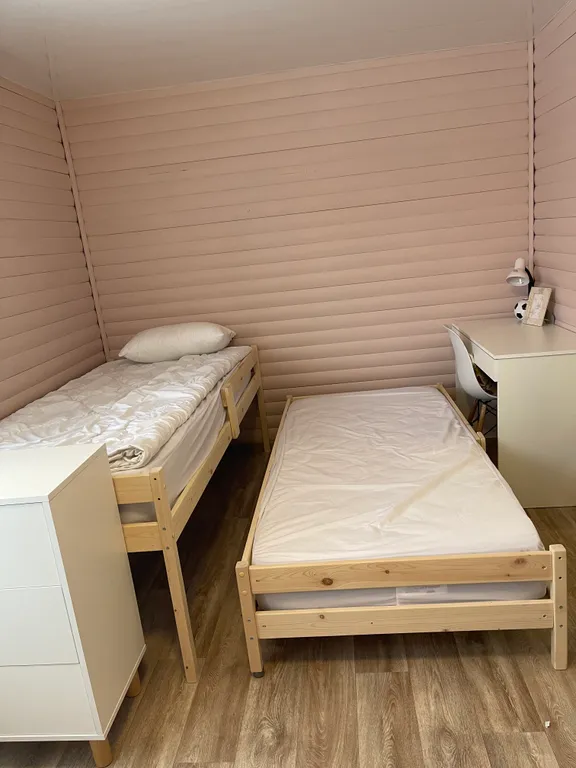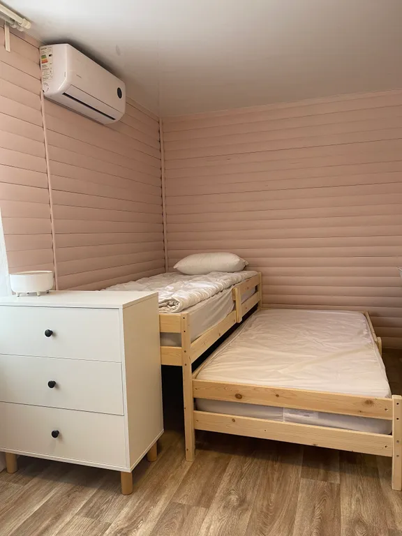 Спальня на 4 человека. Вся мебель новая: 1 двуспальная кровать, 1 кровать на 2 яруса выдвижная (второй ярус можно ставить в любом месте, даже переносить в другую спальню), 2 прикроватные тумбы с ящиками, комод, стол письменный/компьютерный, стул, вешалка для хранения вещей, настольная лампа и 2 ночника.