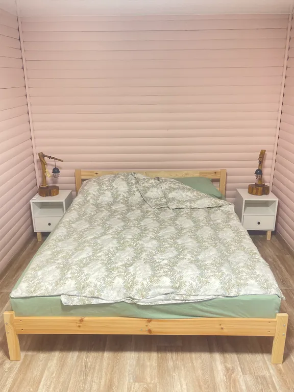 Спальня на 2 человека: 1 двуспальная кровать, 2 прикроватные тумбы с ящиками, 2 ночника, комод, шкаф, журнальный столик, вешалка напольная, кресло-мешок, детская кроватка с высокими бортиками для детей до 3-х лет.