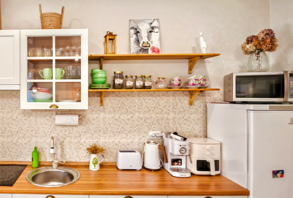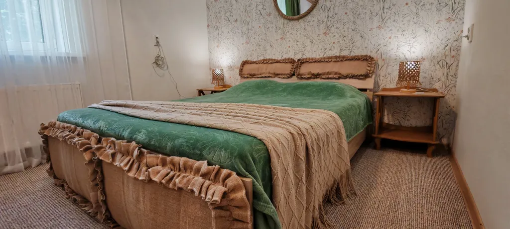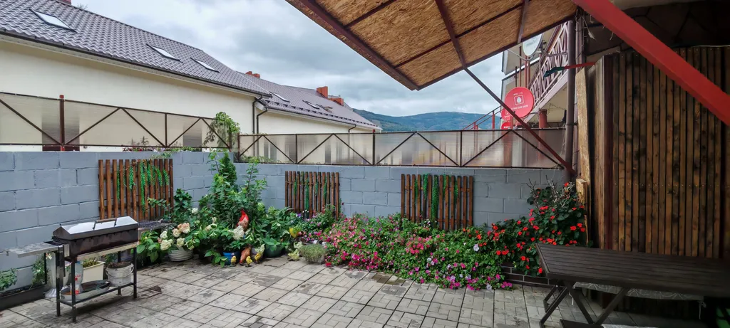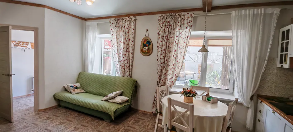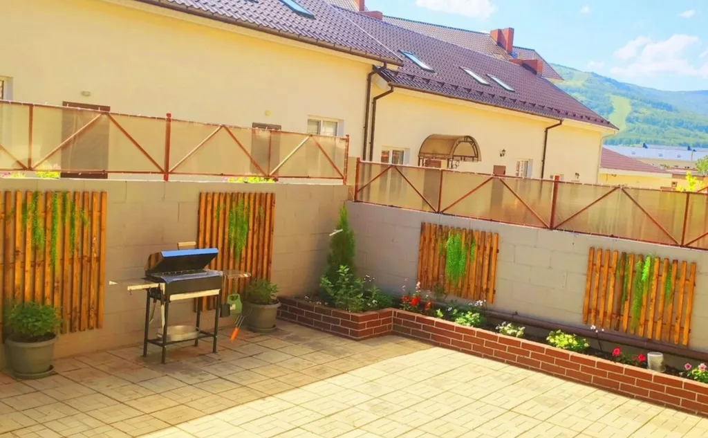 Таунхаус с персональным двором оснащён всем необходимым для качественного отдыха после активного дня. Кухня, объединённая с гостиной, полностью укомплектована для приготовления и употребления пищи. В спальне большая двуспальная кровать с ортопедическим матрасом и одна односпальная, бельевой шкаф. В спгузле душевая со всеми гигиеническими принадлежности, электрическая сауна с паром.