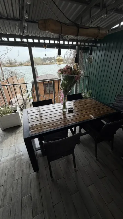 Cтoлом и стульями. 2-х этажный дом с выходом к реке включает в себя ещё один уровень с зоной барбекю, и бассейном в летнее время.