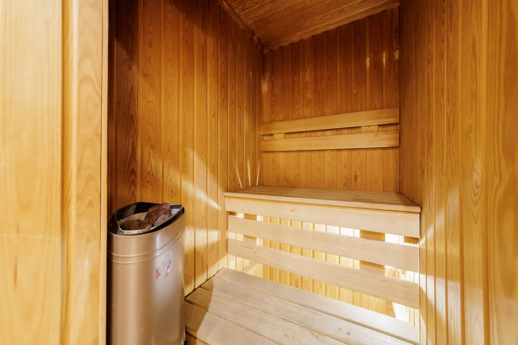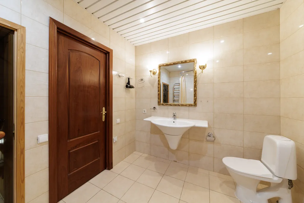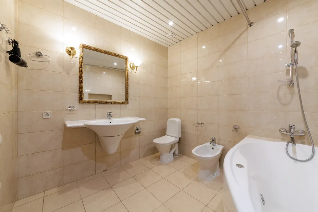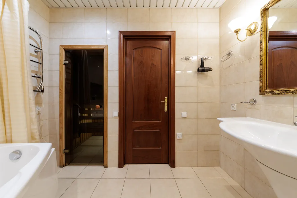 Два санузла! В одном — сауна, джакузи, душ, биде, унитаз, раковина. Во втором — душ и туалет с раковиной.
