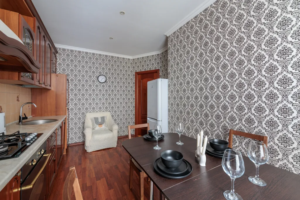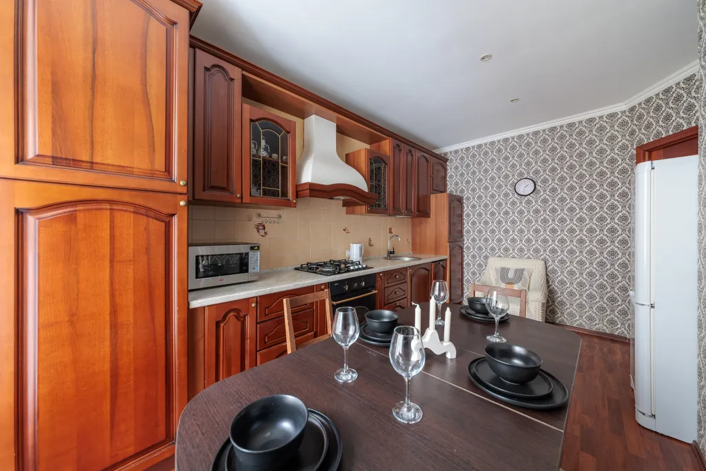 Есть отдельная оснащенная кухня с плитой, духовкой, всей посудой, холодильником.