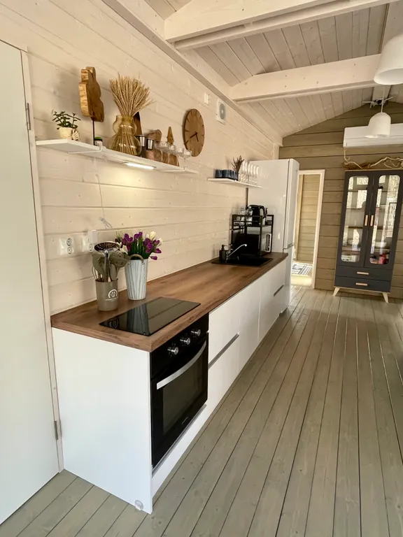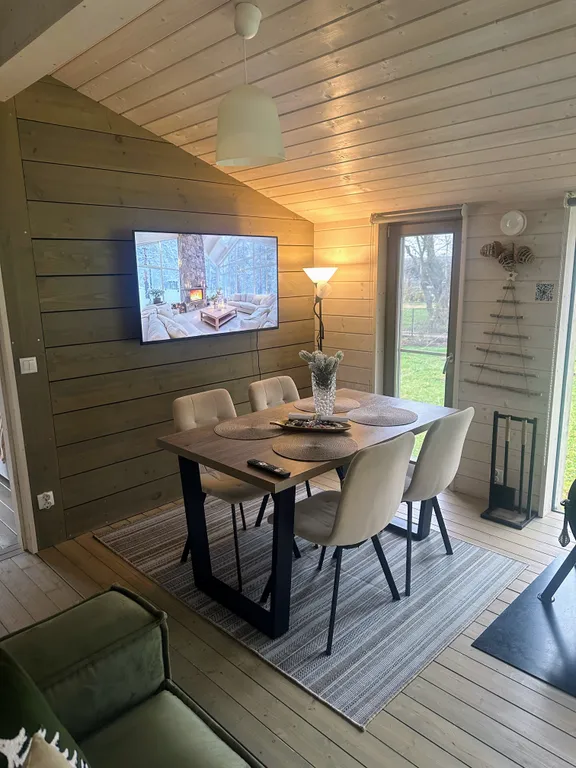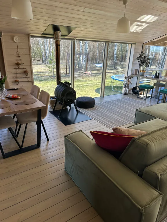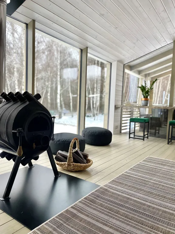 - Дом подходит для отдыха круглый год: электрические конвекторы, кондиционер, камин