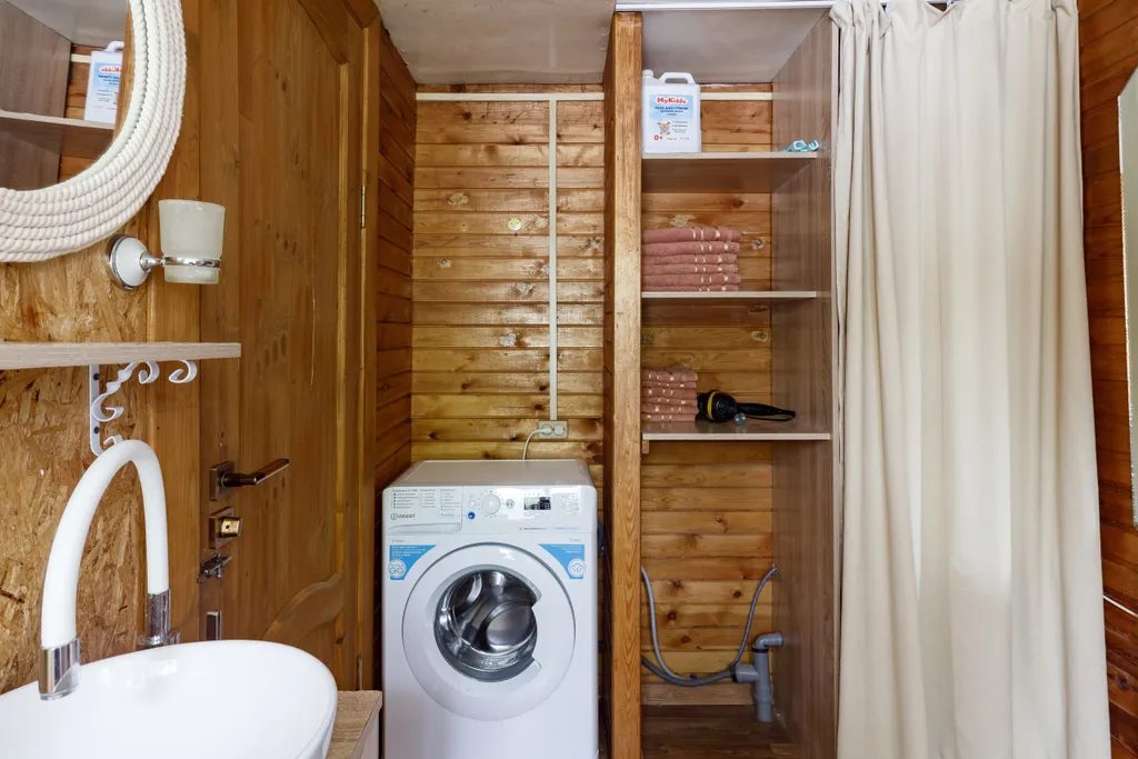 Санузел с душевой кабиной, стиральная машина, фен для волос, полотенца, гигиенические принадлежности