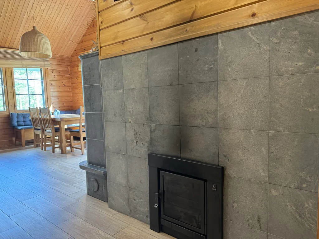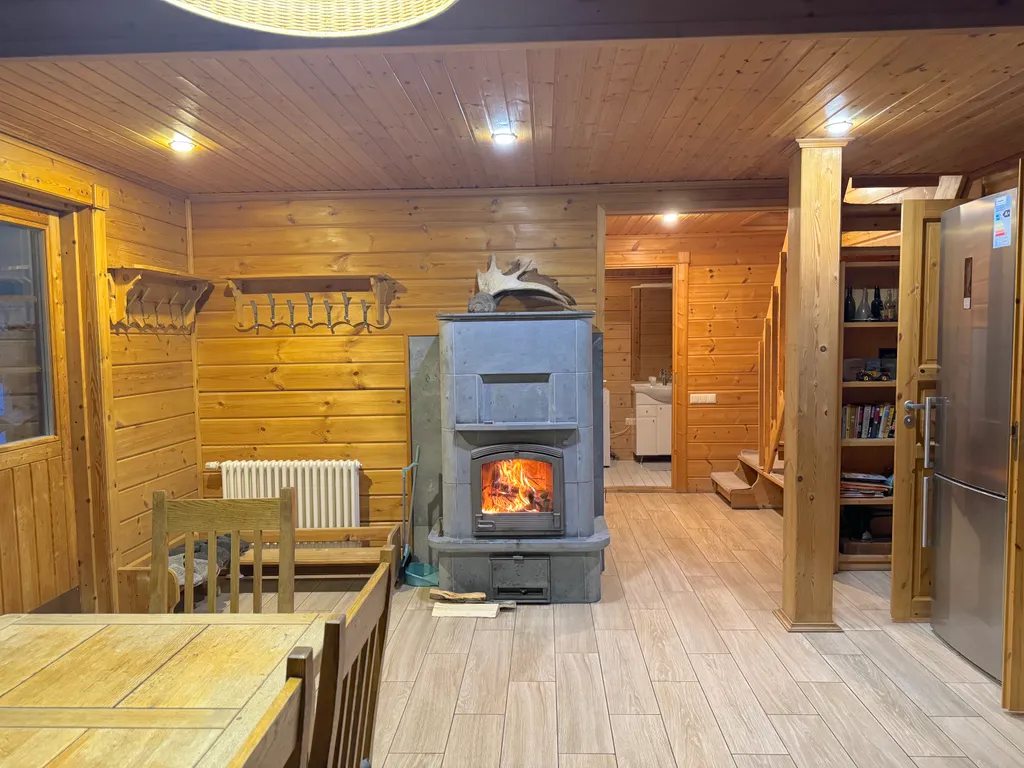Финский камин (тепло в доме также поддерживает центральная котельная и идет на отопление батарей в комнатах и пола в кухне-гостиной).
