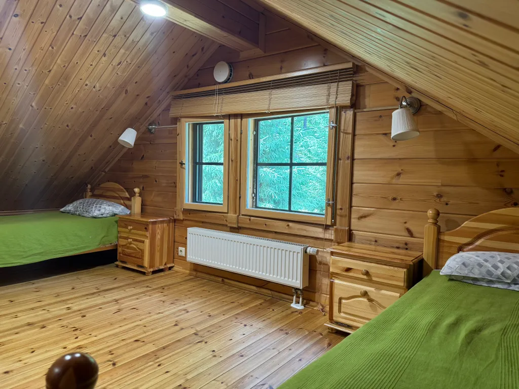 3 спальни (до 6 гостей): на 1 этаже две комнаты с двуспальными кроватями, на 2 этаже одна комната с двумя односпальными кроватями (по запросу предоставляем детскую кроватку, стульчик, горшок).
