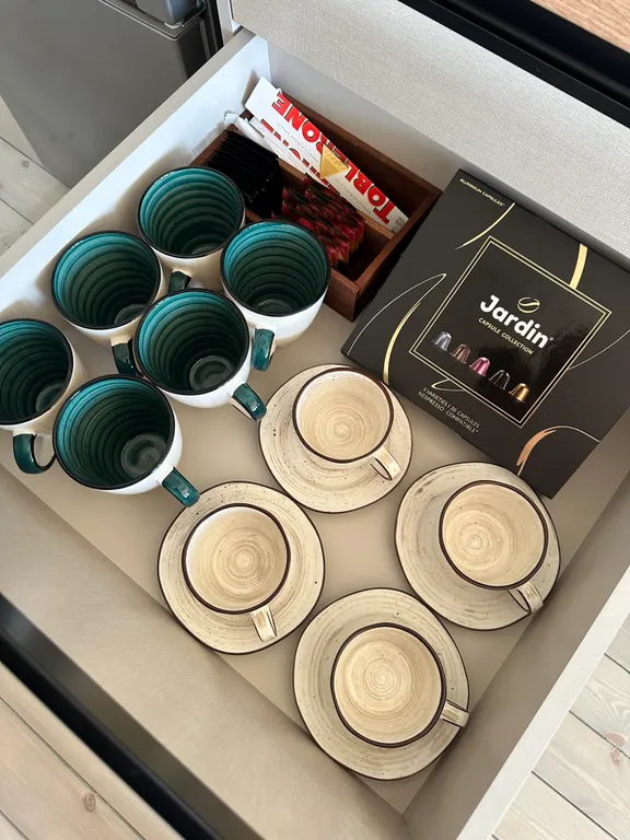 - Полностью укомплектованная кухня: посудомойка, индукционная плита, духовой шкаф, кофемашина Nespresso, микроволновка, холодильник.