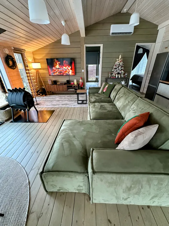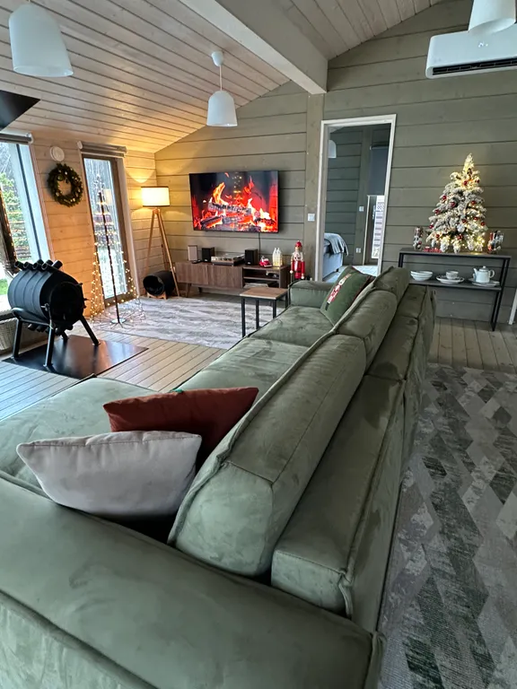 - Просторная гостиная с камином и диваном (доп. спальные места).