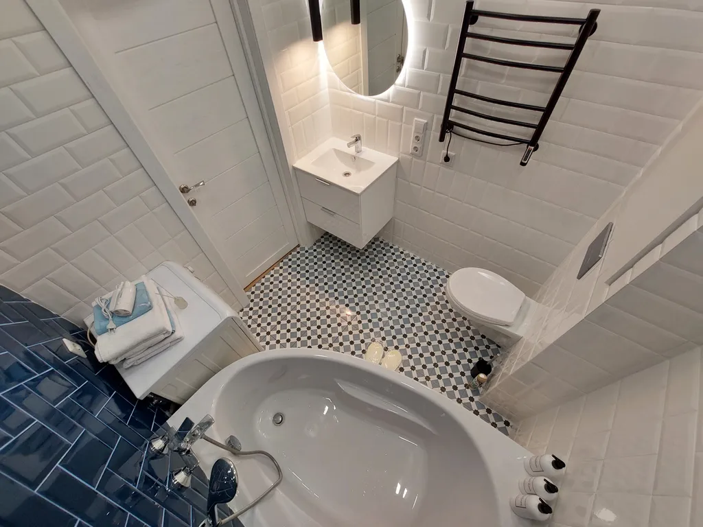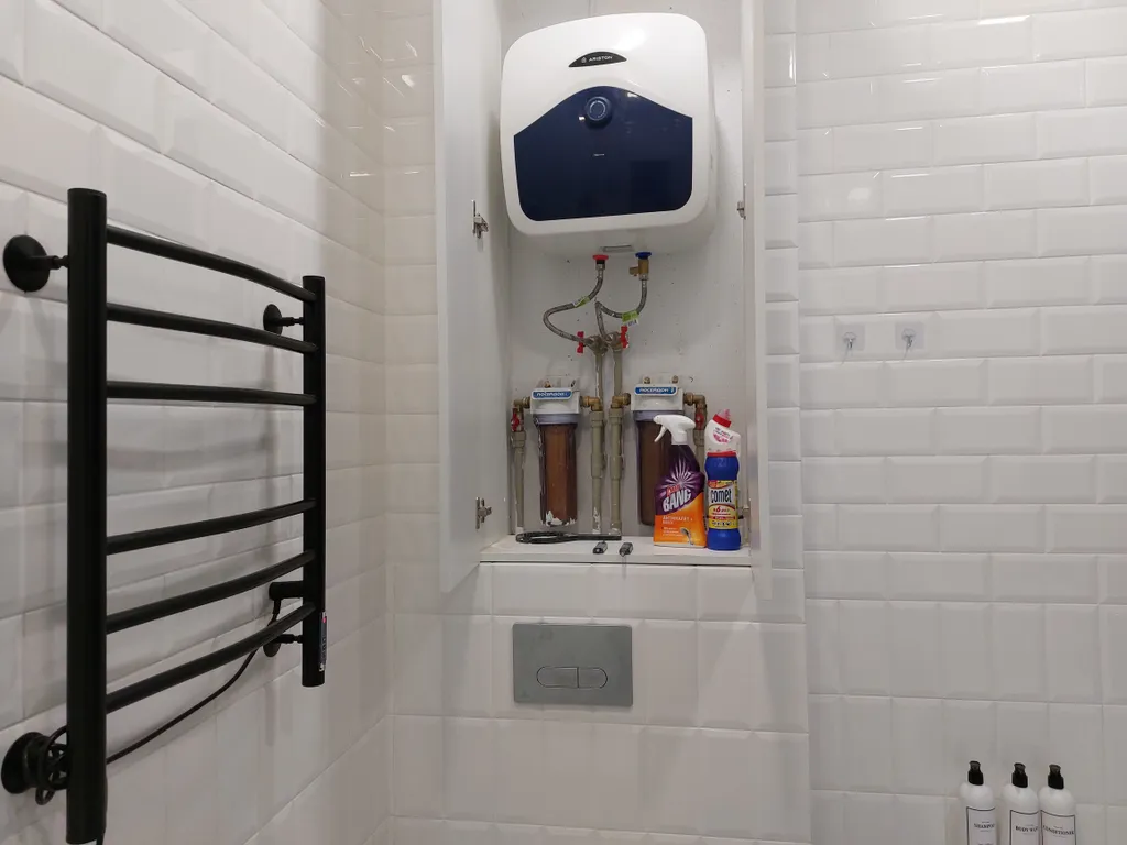 Большая ванна, чтобы расслабиться. У нас есть горячая вода всегда благодаря бойлеру. Стоят фильтры очистки воды.