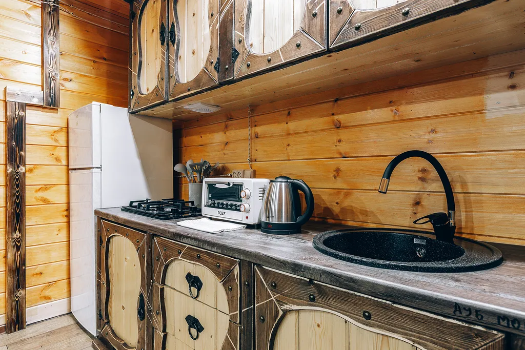 Оборудованная кухня: посуда, холодильник, микроволновка, кастрюли, сковорода, электрический чайник, чай, кофе, сахар.