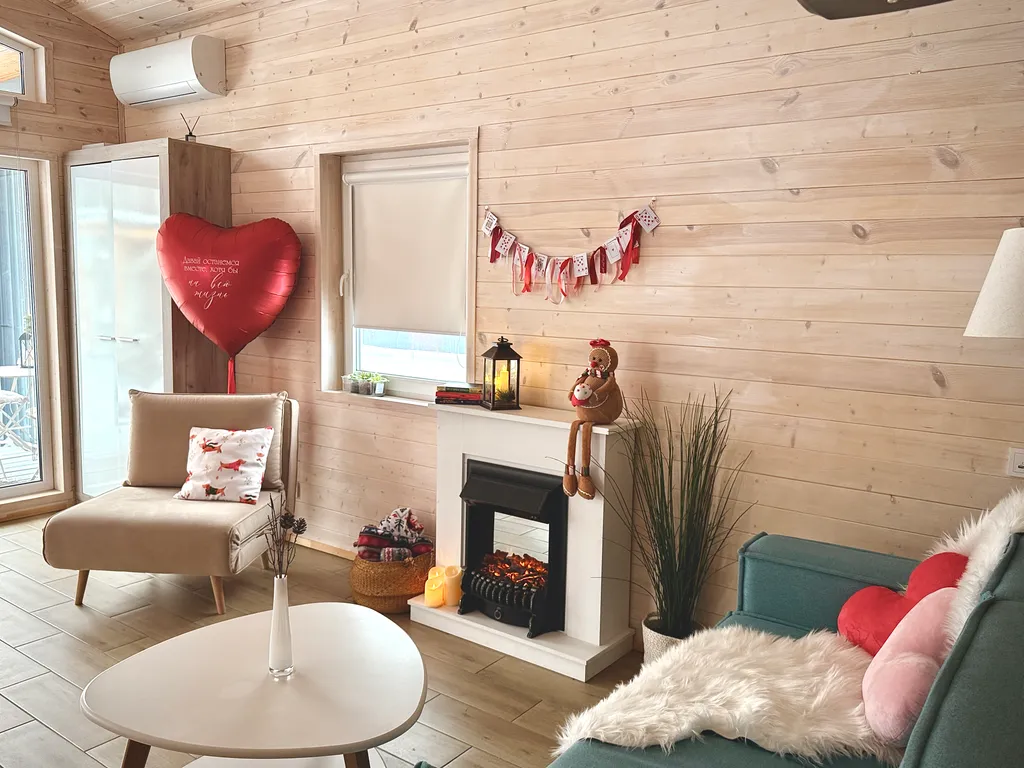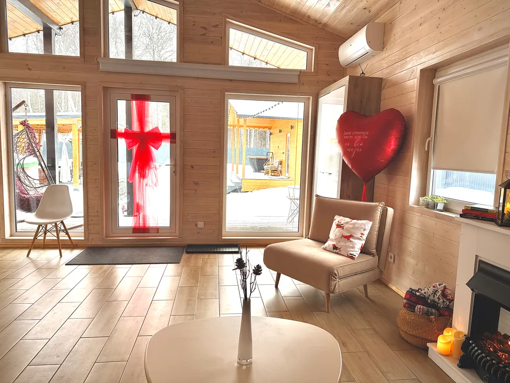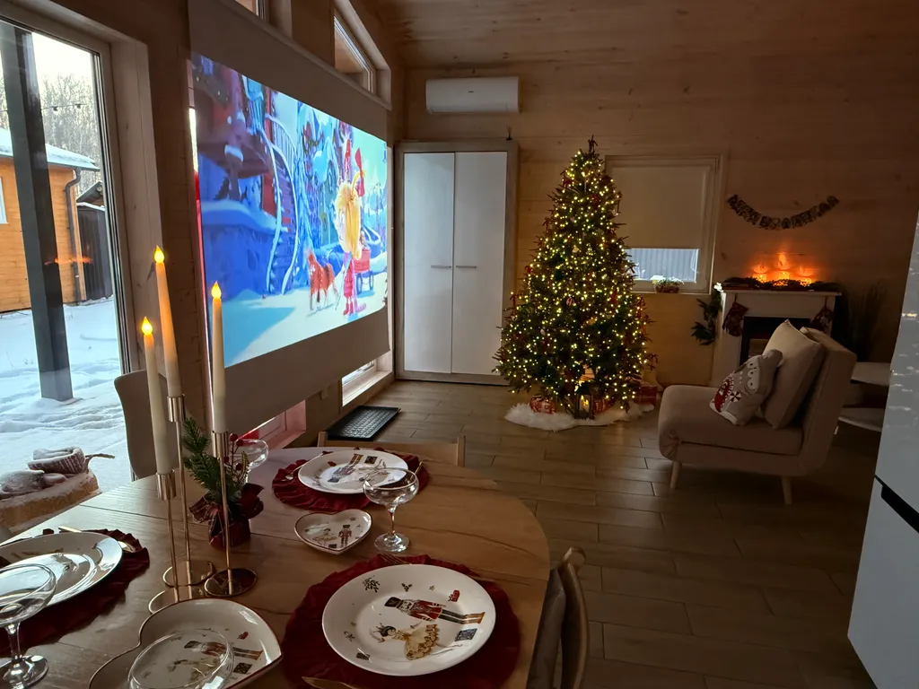 Просторная гостиная с раскладывающимся диваном и кресло-кроватью, для дивана предусмотрен топпер, телевизор smаrt тв, видео проектор с большим экраном, колонка алиса макс, камин, кондиционер, новогодняя елка